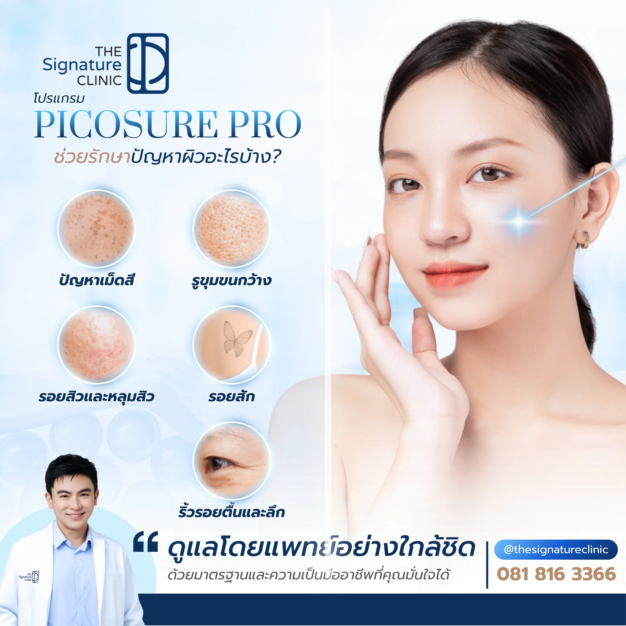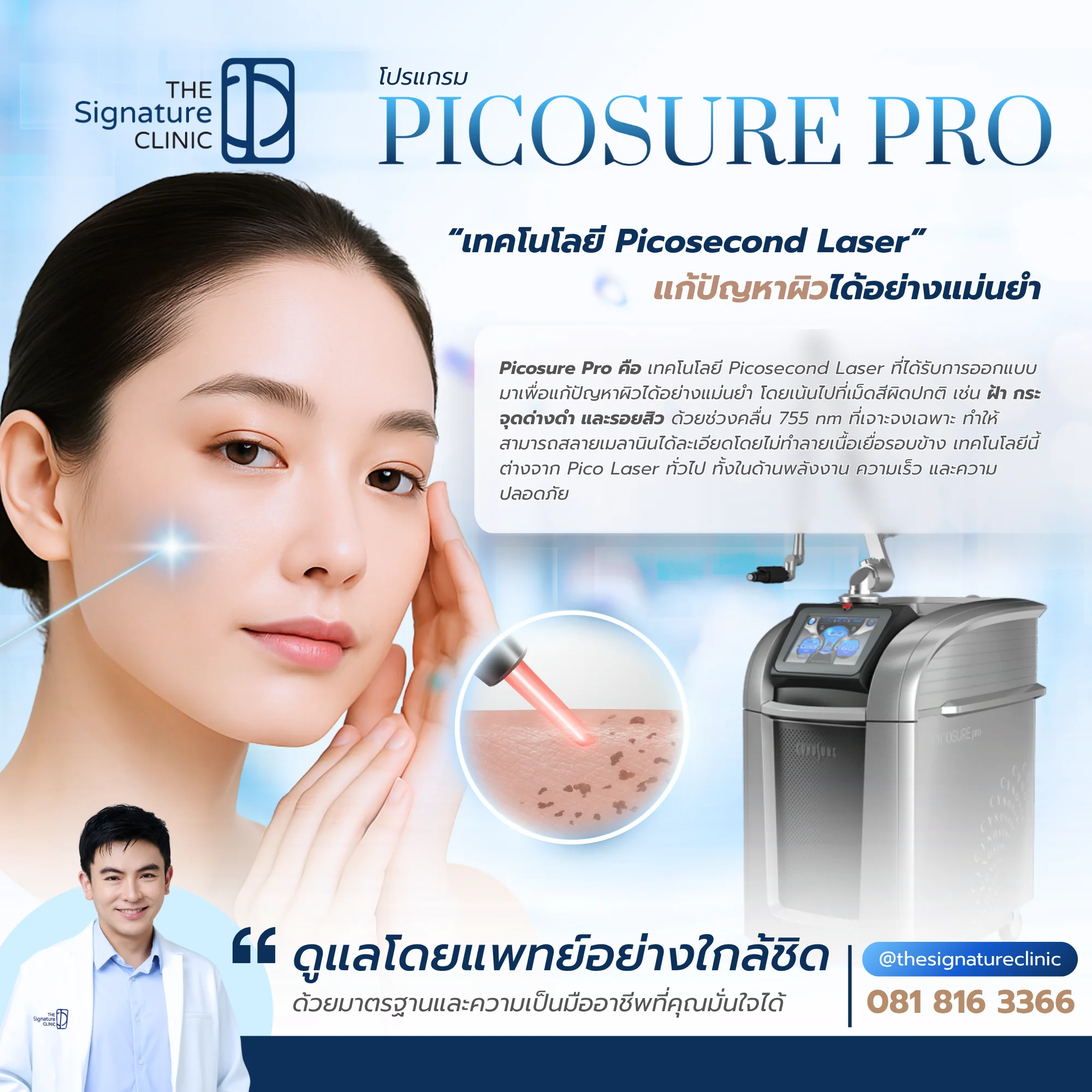 ทีมแพทย์ของ The Signature Clinic นำโดย นพ.ภูริวัจน์ (หมอบอล) ผู้ได้รับการแต่งตั้งเป็น Cynosure Trainer ระดับภูมิภาค ร่วมกับทีมแพทย์ที่เชี่ยวชาญการใช้ Picosecond Laser โดยเฉพาะ พร้อมวิเคราะห์สภาพผิว วิเคราะห์เม็ดสีด้วยระบบ Syris Visualization และติดตามผลการรักษาอย่างต่อเนื่อง