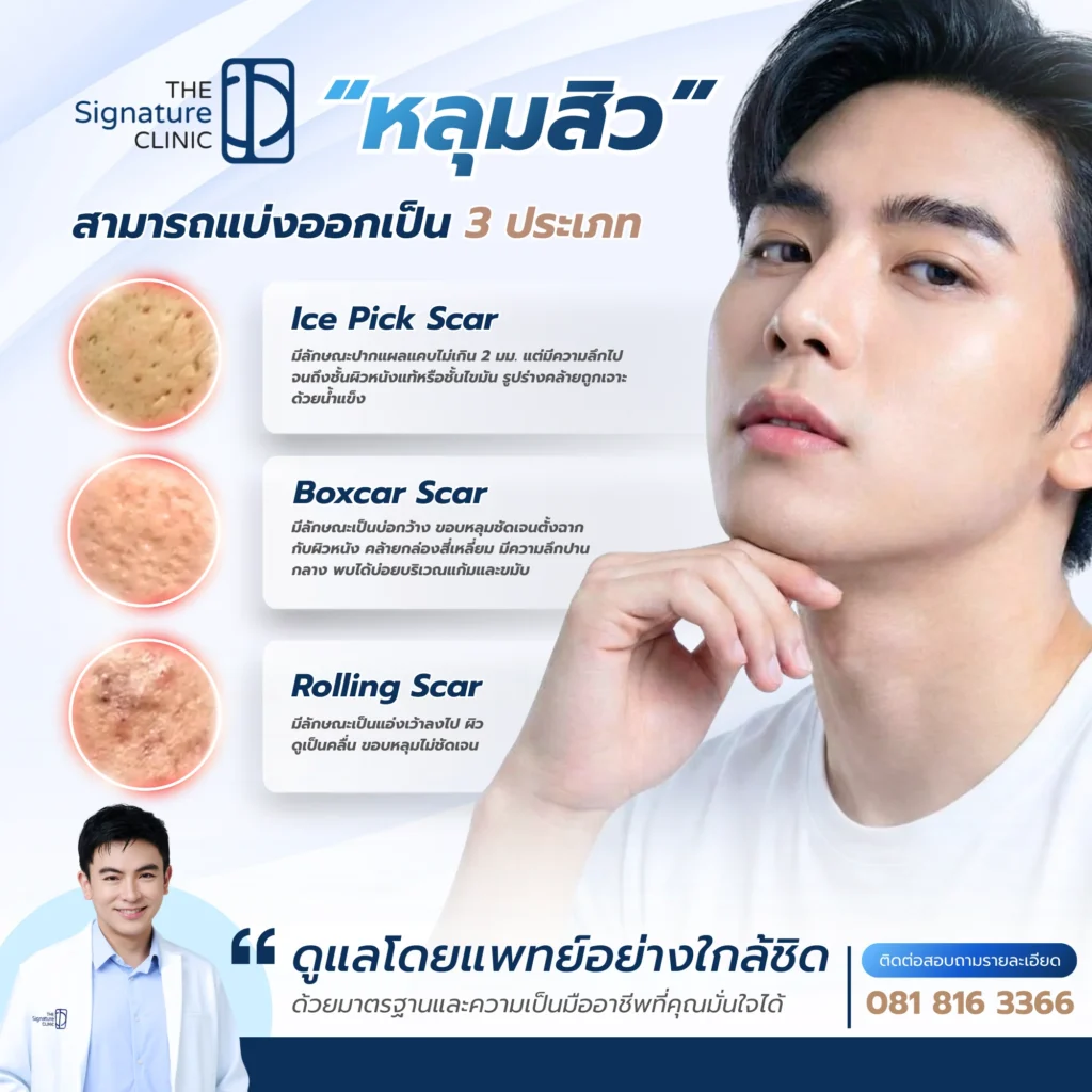 แพทย์ผู้มีความชำนาญการแบ่งลักษณะของแผลเป็นหลุมสิวออกเป็น 3 ประเภทหลัก เพื่อวางแผนการรักษาได้อย่างแม่นยำ ดังนี้: