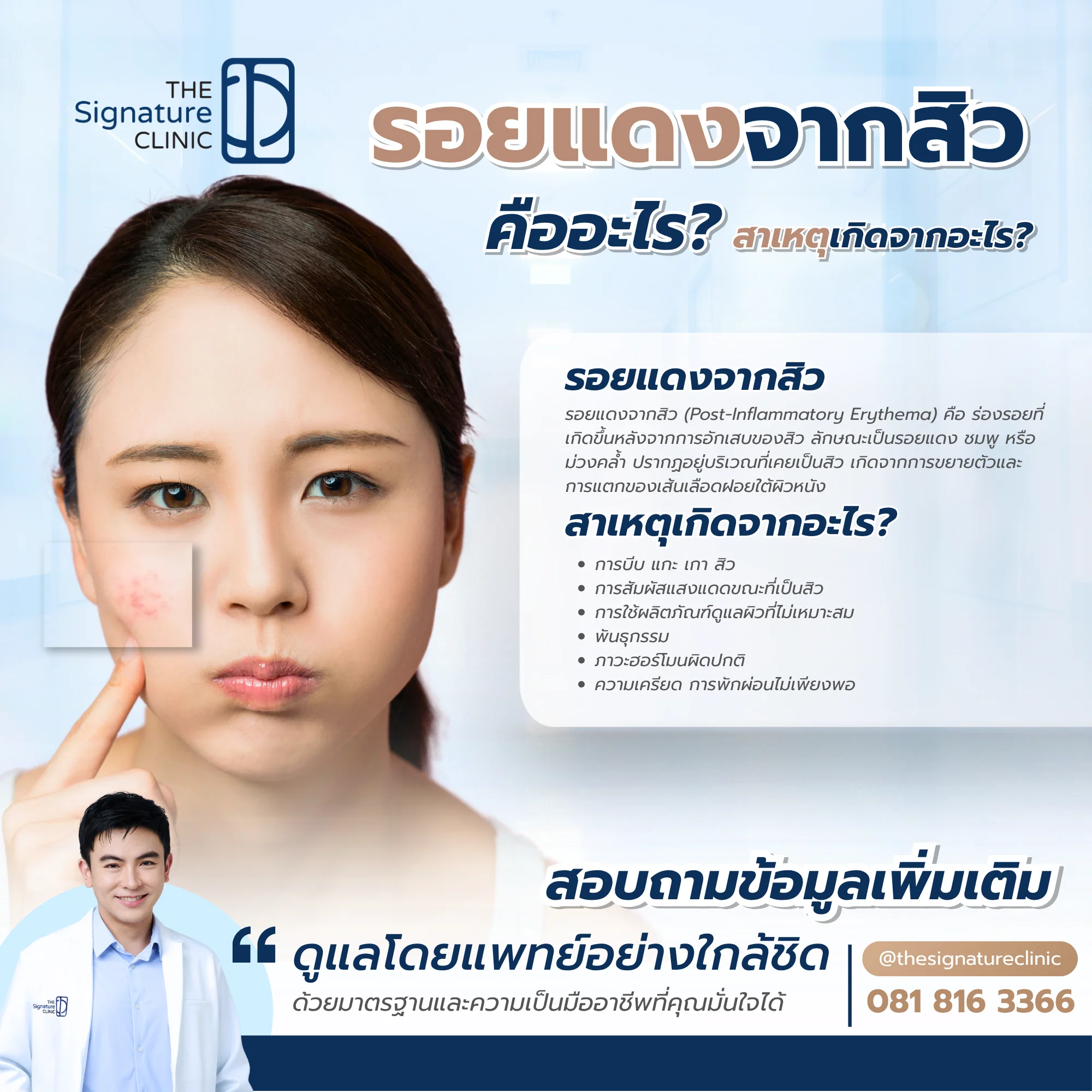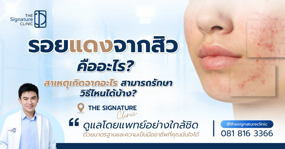 รอยแดงจากสิว เป็นปัญหาผิวที่หลายคนกังวล หลังจากที่สิวยุบตัวลงแล้ว แต่กลับทิ้งร่องรอยเป็นจุดสีแดงไว้บนใบหน้า ส่งผลกระทบต่อความมั่นใจเป็นอย่างมาก แต่ไม่ต้องกังวลไป เพราะปัจจุบันมีวิธีรักษารอยแดงจากสิวที่หลากหลาย ทั้งการดูแลตัวเองที่บ้าน และเข้ารับการรักษาจากผู้ชำนาญการอย่าง The Signature Clinic ที่พร้อมช่วยฟื้นบำรุงผิว เพื่อให้รอยแดงจางลง และมีผิวที่เรียบเนียน กระจ่างใสอย่างเป็นธรรมชาติ