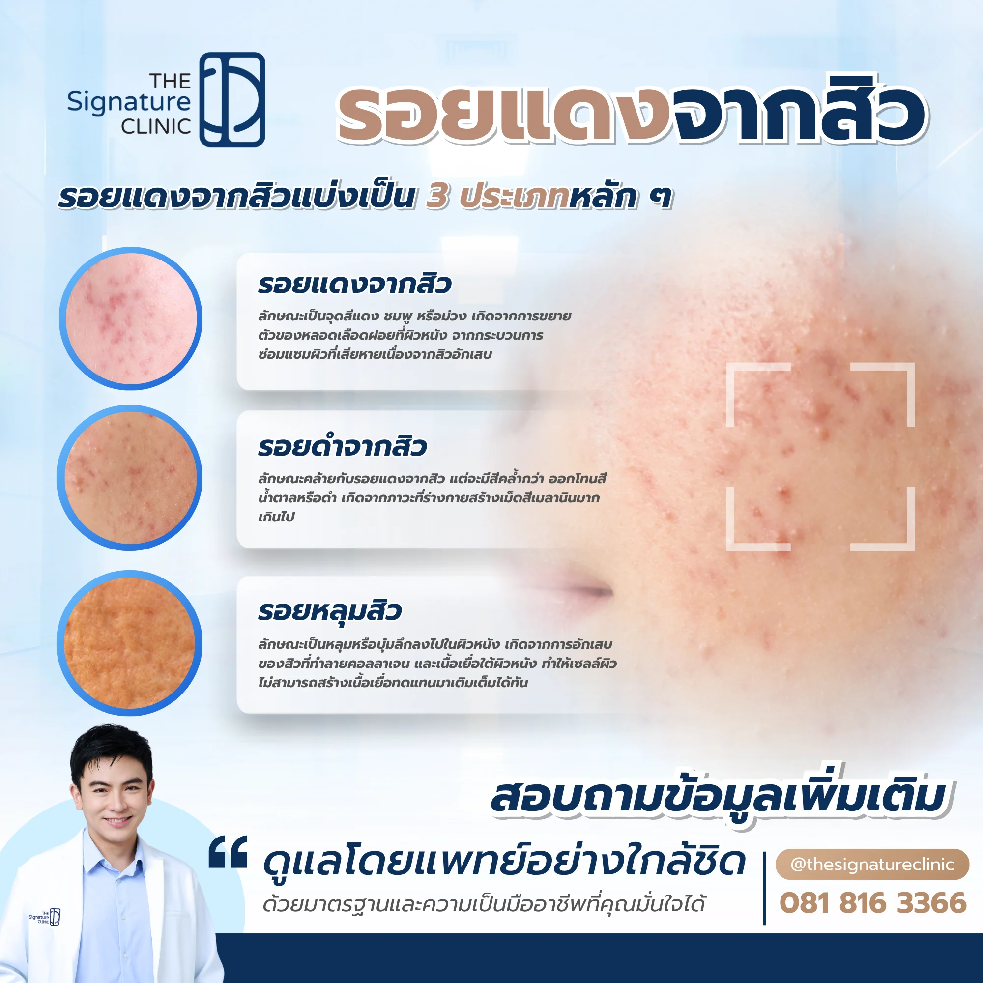 รอยแดงจากสิว เป็นหนึ่งในปัญหาผิวยอดฮิตที่ทำให้หลายคนหมดความมั่นใจ แต่สามารถรักษาให้จางลงได้ด้วยการดูแลผิวอย่างถูกวิธี ทั้งการใช้ผลิตภัณฑ์ที่เหมาะสม การปรับพฤติกรรมในชีวิตประจำวัน ไปจนถึงการรักษาด้วยเทคโนโลยีทางการแพทย์ ซึ่งที่ The Signature Clinic เราพร้อมให้บริการรักษารอยสิวด้วยเทคโนโลยีที่ทันสมัยและปลอดภัย เพื่อมอบผิวสวย กระจ่างใส ปราศจากริ้วรอย ให้คุณมีความมั่นใจในทุกวัน