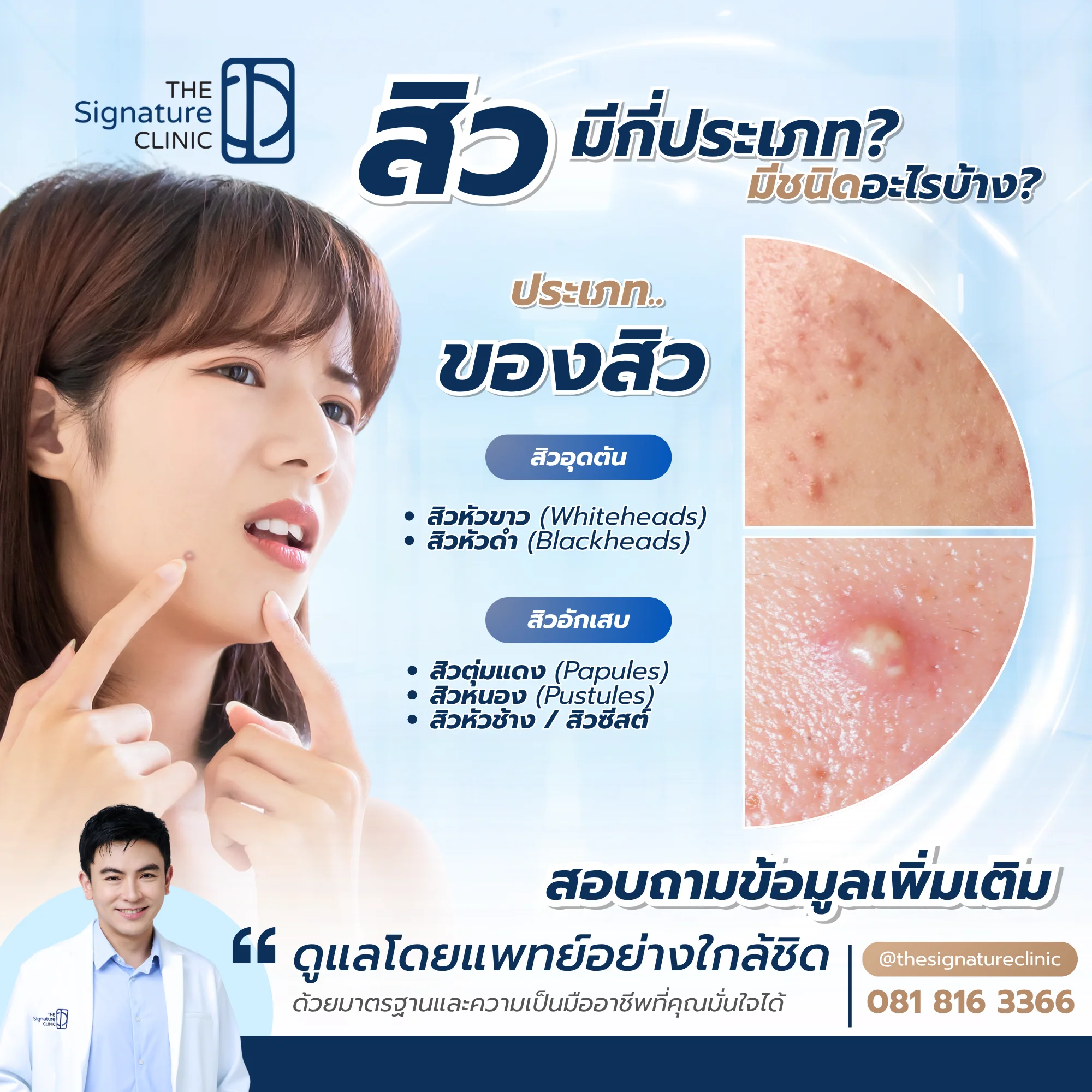 - ประเภทของสิวมีทั้งสิวอุดตัน (หัวขาว หัวดำ) และสิวอักเสบ (ตุ่มแดง หนอง หัวช้าง) โดยการรักษาแต่ละประเภทจะมีวิธีที่แตกต่างกัน ทั้งการใช้ยาแต้ม ยารับประทาน การกดสิว หรือหัตถการทางการแพทย์