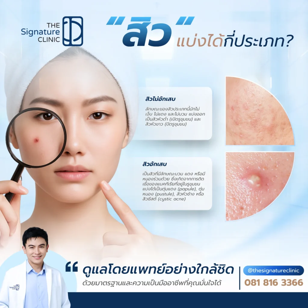 การจำแนกประเภทของสิวจะช่วยให้สามารถเลือกวิธีดูแลที่ตรงจุด โดยทั่วไปสามารถแบ่งสิวได้เป็น 2 กลุ่มใหญ่ คือ สิวไม่อักเสบ และสิวอักเสบ ซึ่งมีลักษณะแตกต่างกันทั้งในด้านลักษณะ รูปร่าง และระดับความรุนแรง