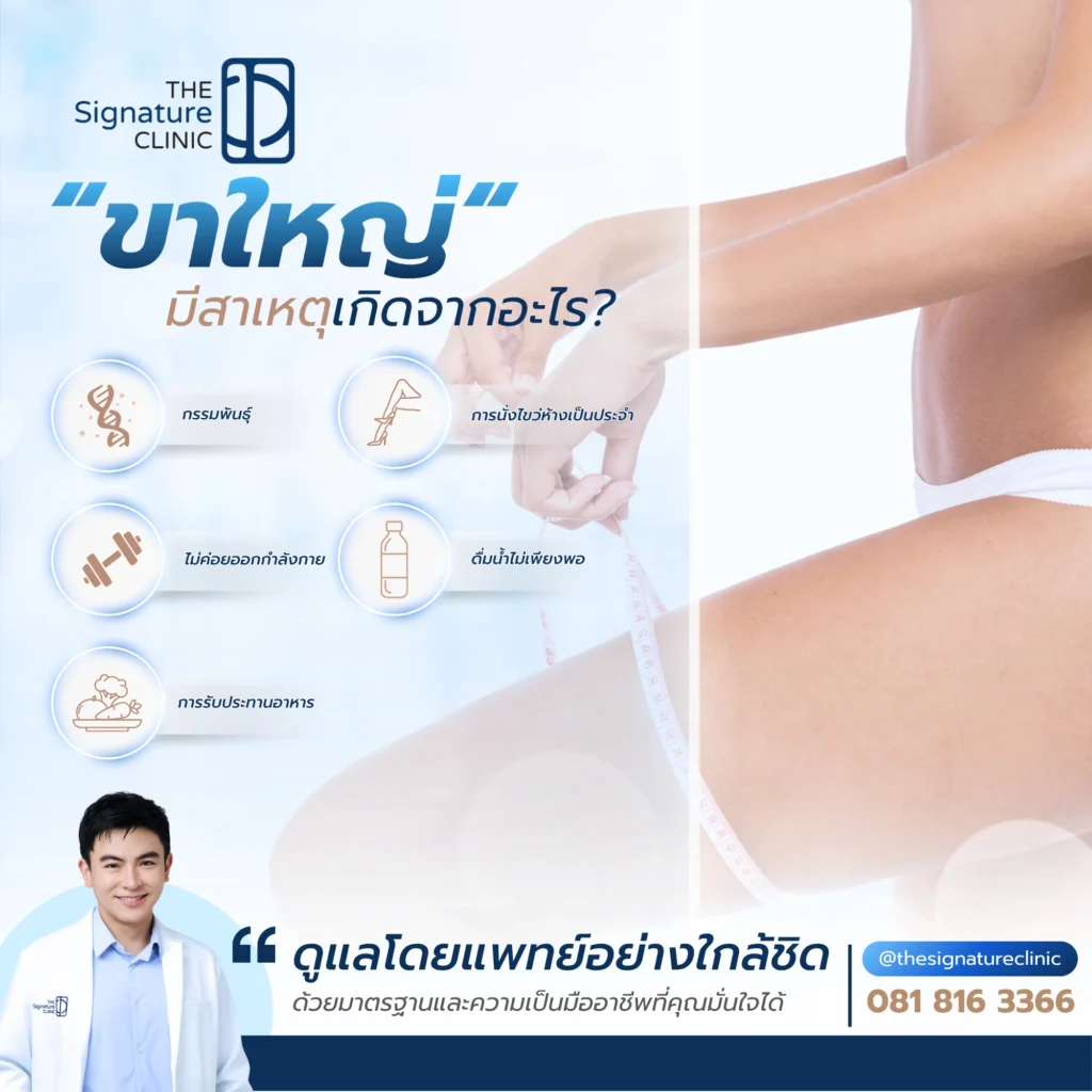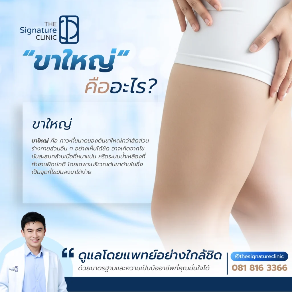ขาใหญ่ เป็นปัญหาที่สามารถจัดการได้ หากเข้าใจสาเหตุและเลือกแนวทางดูแลอย่างเหมาะสม ไม่ว่าจะเกิดจากไขมัน กล้ามเนื้อ หรือการบวมน้ำ โดยเฉพาะการปรับพฤติกรรม ร่วมกับการใช้เทคโนโลยีทางการแพทย์จาก The Signature Clinic จะช่วยให้เห็นผลลัพธ์ได้อย่างมีประสิทธิภาพและปลอดภัยเสมอ อย่าปล่อยให้ต้นขาใหญ่เป็นอุปสรรคของความมั่นใจ เริ่มต้นดูแลตั้งแต่วันนี้เพื่อรูปร่างที่ดีและสุขภาพที่ยั่งยืน