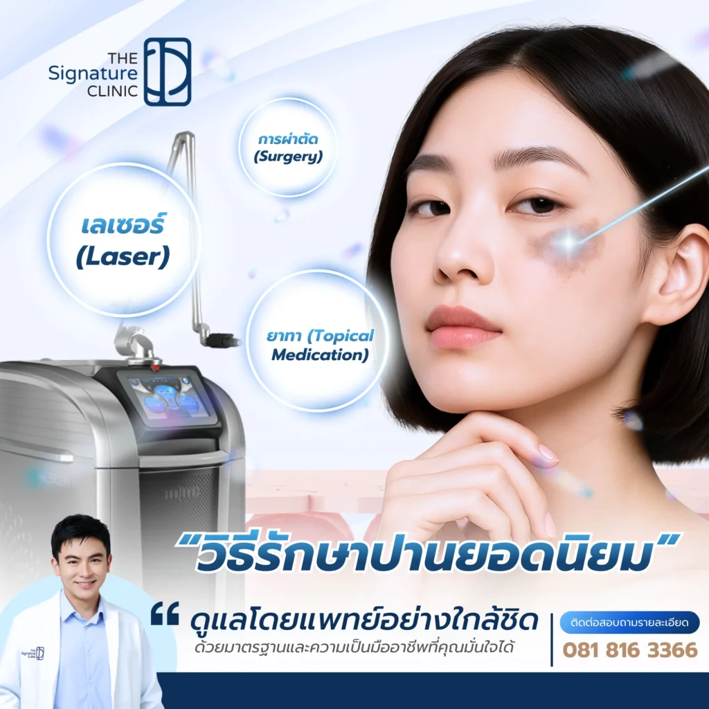 ที่ The Signature Clinic เรายึดมั่นในค่านิยม Safety First และ Expertise นำทีมโดยแพทย์ระดับอาจารย์ผู้สอน (Medical Trainer) ที่มีความชำนาญการในการใช้เลเซอร์ขั้นสูง เราเลือกใช้ Picosure Pro ซึ่งเป็นนวัตกรรม Picosecond Laser รุ่นใหม่ล่าสุดจาก Cynosure (USA) ที่ได้รับการยอมรับทั่วโลกว่ามีประสิทธิภาพสูงสุดในการกำจัดเม็ดสี โดยไม่ทำลายเนื้อเยื่อข้างเคียง ในฐานะที่เราเป็น Cynosure Signature Partner ท่านจึงมั่นใจได้ว่าเครื่องมือทุกชิ้นเป็นของแท้ ได้มาตรฐานระดับโลก พร้อมเทคนิคการยิงเลเซอร์เฉพาะบุคคลที่แพทย์ออกแบบให้เหมาะกับสภาพผิวและชนิดของปานของท่าน เพื่อผลลัพธ์ที่จางลงอย่างเป็นธรรมชาติและปลอดภัยที่สุด ดูข้อมูบริการและนัดหมายปรึกษาแพทย์เพื่อประเมินการรักษาปานของคุณ