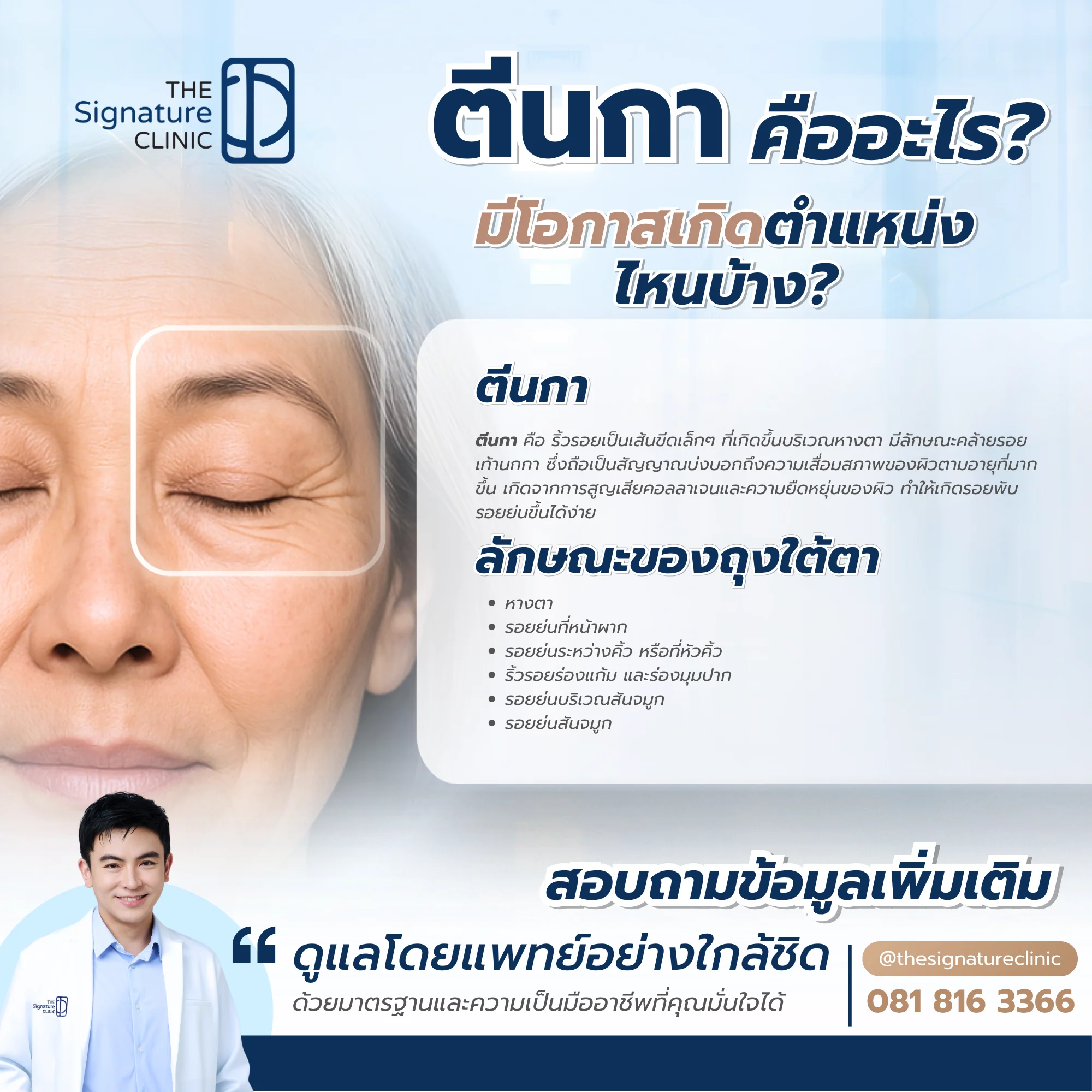 - The Signature Clinic ให้บริการรักษาตีนกาอย่างมืออาชีพด้วยเทคโนโลジีเลเซอร์ Potenza และ Picosure Pro ล่าสุด ร่วมกับการฉีดฟิลเลอร์ภายใต้การดูแลของทีมแพทย์ผู้เชี่ยวชาญ เพื่อช่วยลดเลือนรอยตีนกาให้ผิวกลับมากระชับ เรียบเนียน ดูอ่อนเยาว์อีกครั้งอย่างเป็นธรรมชาติและปลอดภัย