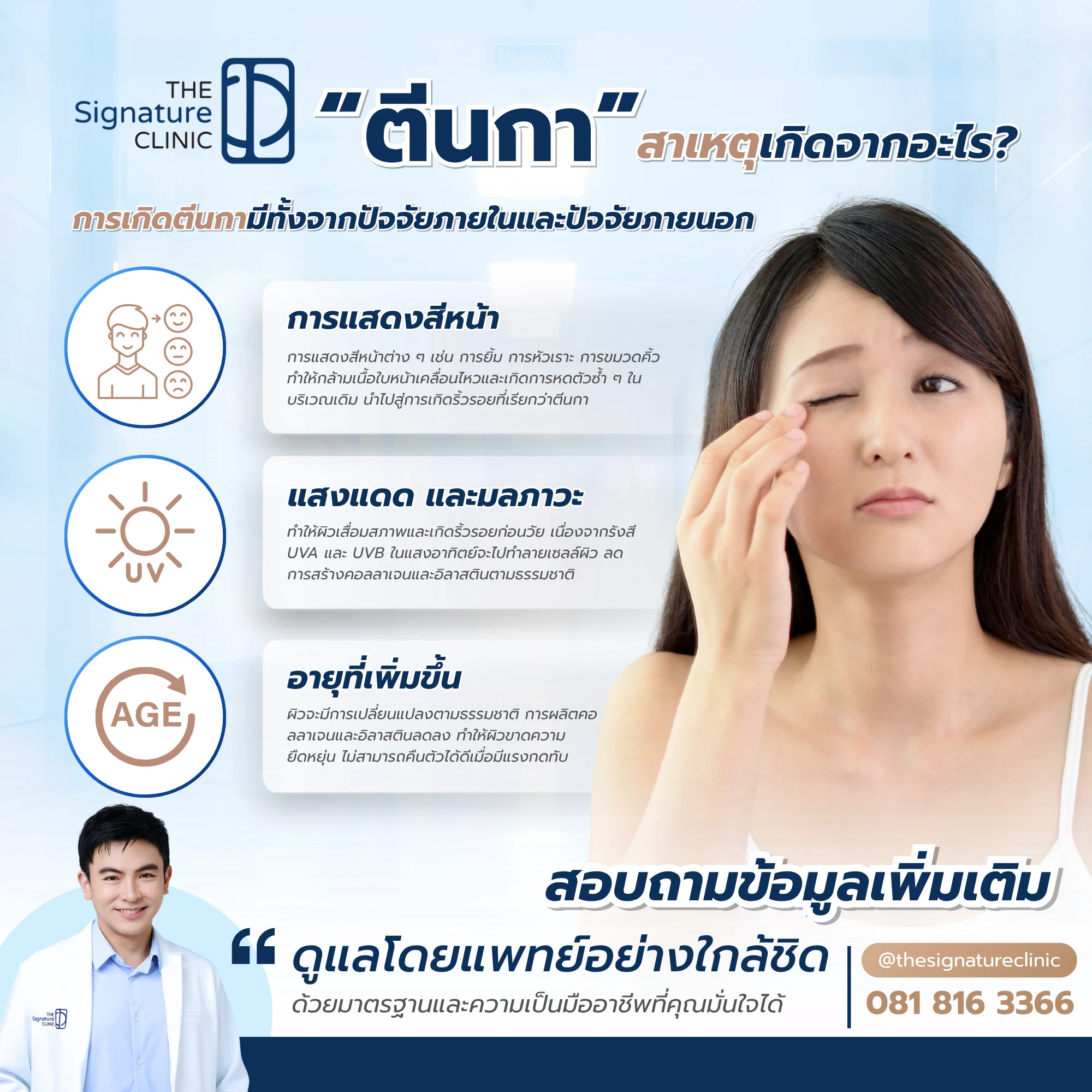 ตีนกา เป็นหนึ่งในปัญหาริ้วรอยที่กวนใจใครหลายคนเมื่อเริ่มมีอายุมากขึ้น แต่เราสามารถป้องกันและรักษาตีนกาได้ด้วยวิธีการดูแลผิวที่ถูกต้องในชีวิตประจำวัน ร่วมกับการรักษาด้วยเทคโนโลยีทางการแพทย์ที่เหมาะสม โดย The Signature Clinic พร้อมให้คำแนะนำ พร้อมดูแลปัญหาตีนกาของคุณด้วยเทคโนโลยีที่ทันสมัย ปลอดภัย ให้คุณมั่นใจได้ในทุกขั้นตอนของการรักษา เพื่อให้ใบหน้าของคุณกลับมาดูอ่อนเยาว์ สวยใสปราศจากริ้วรอยดั่งใจต้องการ