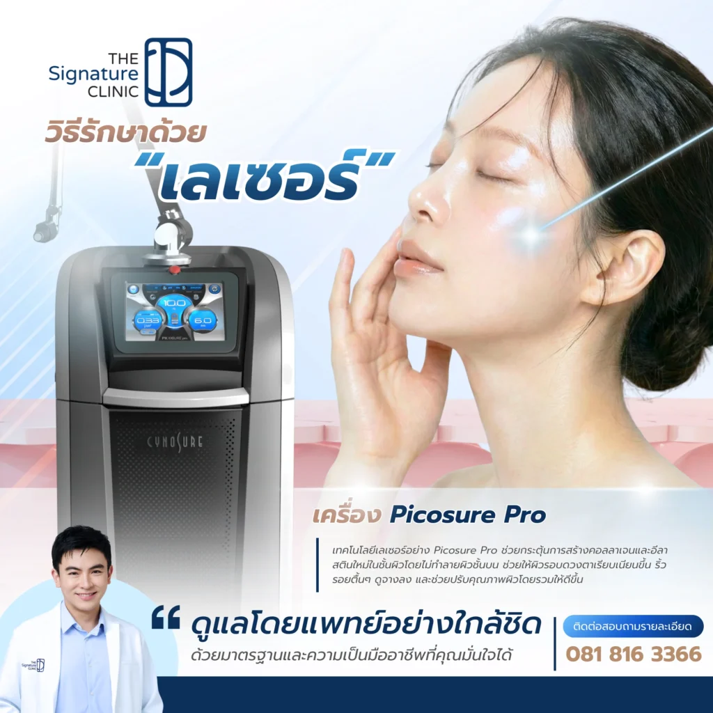 - เลือกสิ่งที่ใช่: เพื่อความปลอดภัยและผลลัพธ์ที่เป็นธรรมชาติ ควรปรึกษาแพทย์ผู้ชำนาญการ ที่ The Signature Clinic เราพร้อมดูแลด้วยทีมแพทย์ระดับ Medical Trainer และเทคโนโลยีมาตรฐานโลกอย่าง Picosure Pro (Cynosure Signature Partner) ที่อ่อนโยนต่อผิวรอบดวงตา