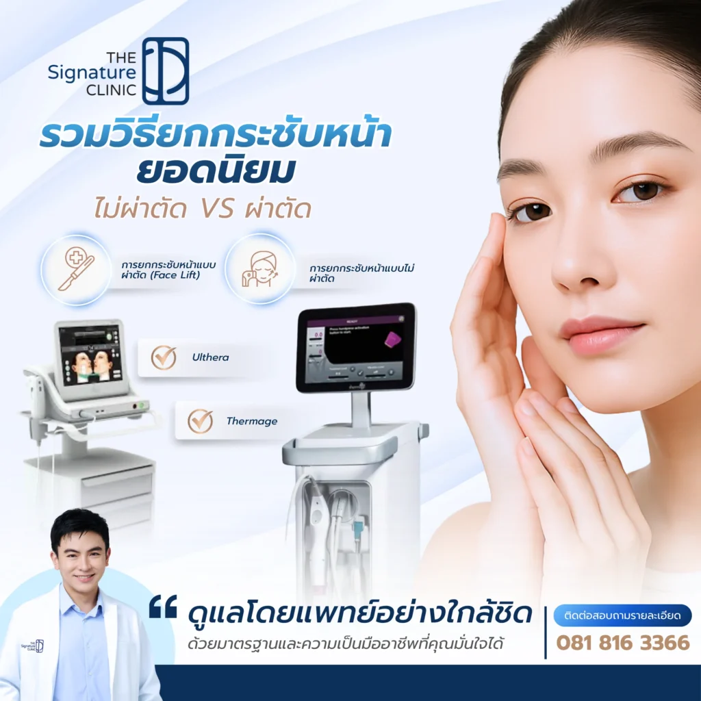 | Ulthera | อัลตราซาวด์แบบ MFU-V (Ultrasound) | ผิวหย่อนคล้อยปานกลางถึงมาก ต้องการยกกระชับผิวชั้นลึก (SMAS) | ผิวค่อยๆ กระชับขึ้นในช่วง 1-2 เดือน อยู่ได้นานประมาณ 1 ปี |