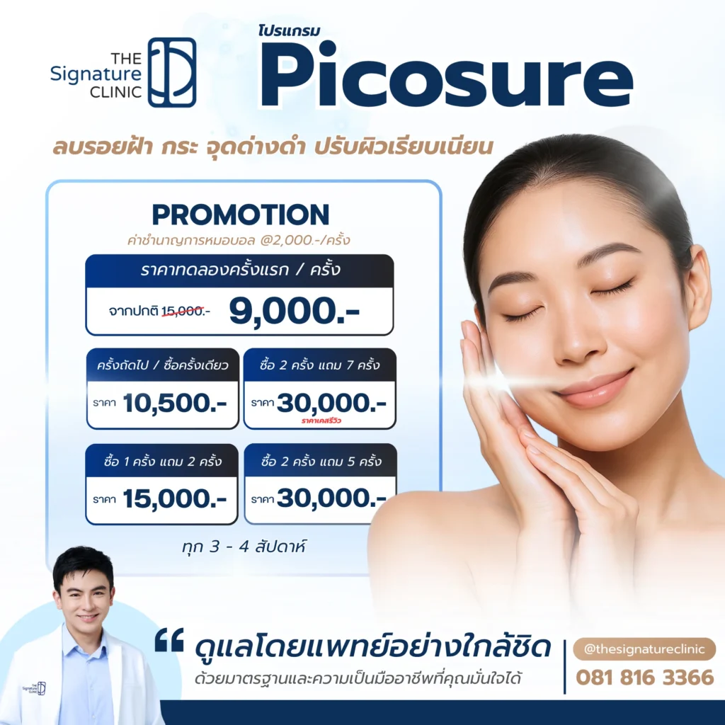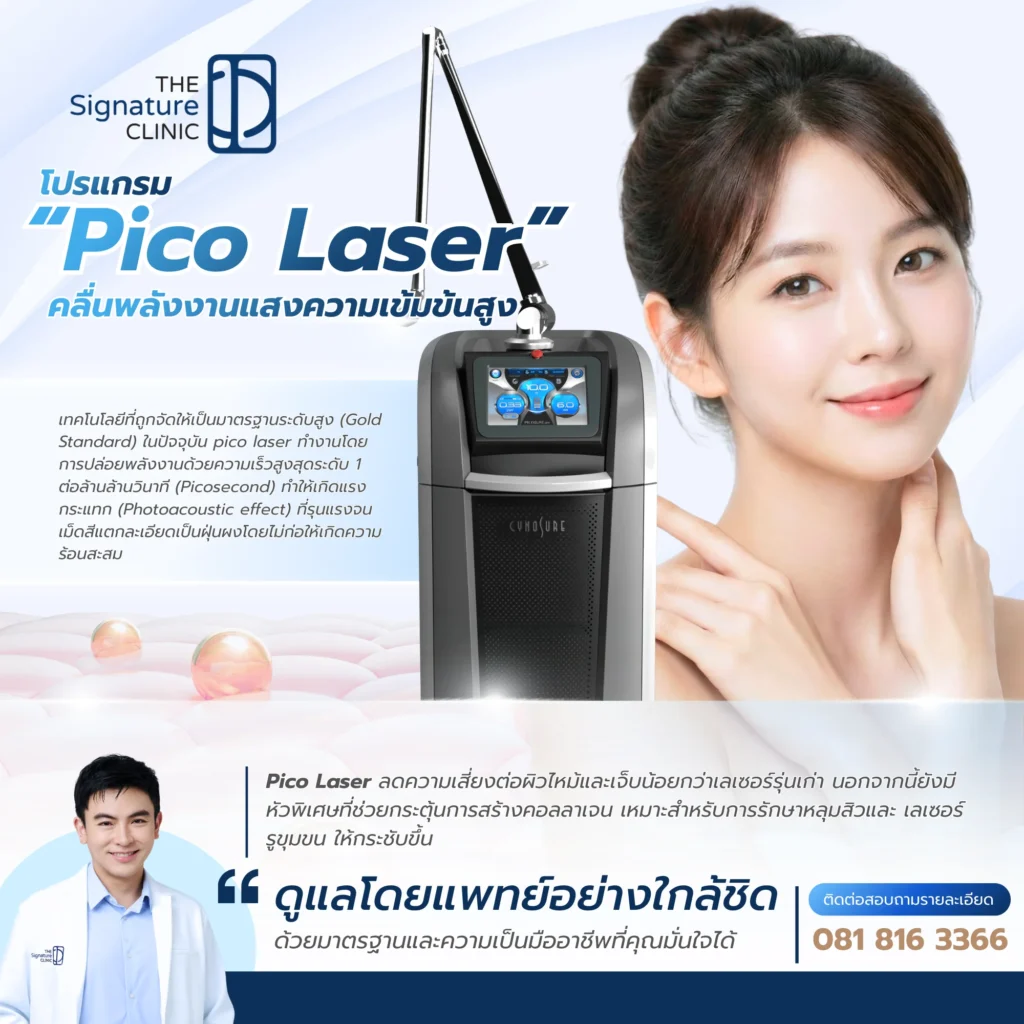 สำหรับผู้ที่มองหาความเป็นเลิศในการดูแลผิวพรรณ The Signature Clinic พร้อมให้บริการด้วยมาตรฐานสูงสุดในฐานะ Cynosure Signature Partner ซึ่งการันตีการใช้เครื่อง Picosure Pro แท้ มาตรฐาน US FDA ดูแลและวางแผนการรักษาโดยทีมแพทย์ระดับ Official Medical Trainer ผู้มีความชำนาญการพิเศษในการวิเคราะห์โครงสร้างผิวและปรับตั้งค่าพลังงานอย่างละเอียด เพื่อผลลัพธ์ผิวที่เรียบเนียน กระจ่างใส และ เลเซอร์รูขุมขน ให้กระชับอย่างเป็นธรรมชาติ โดยคำนึงถึงความปลอดภัยและความพึงพอใจของผู้รับบริการเป็นที่ตั้ง สามารถดูรายละเอียดเทคโนโลยีของเราได้ที่ Picosure Pro