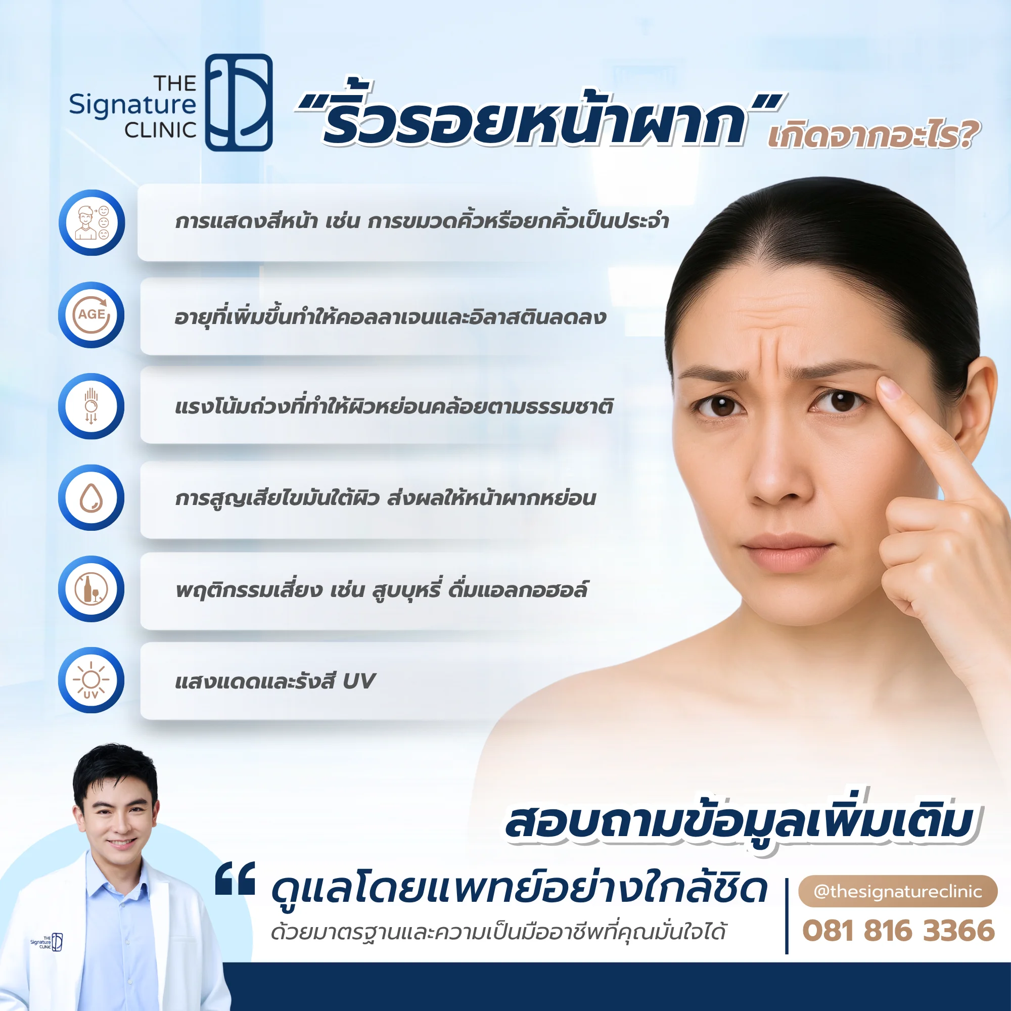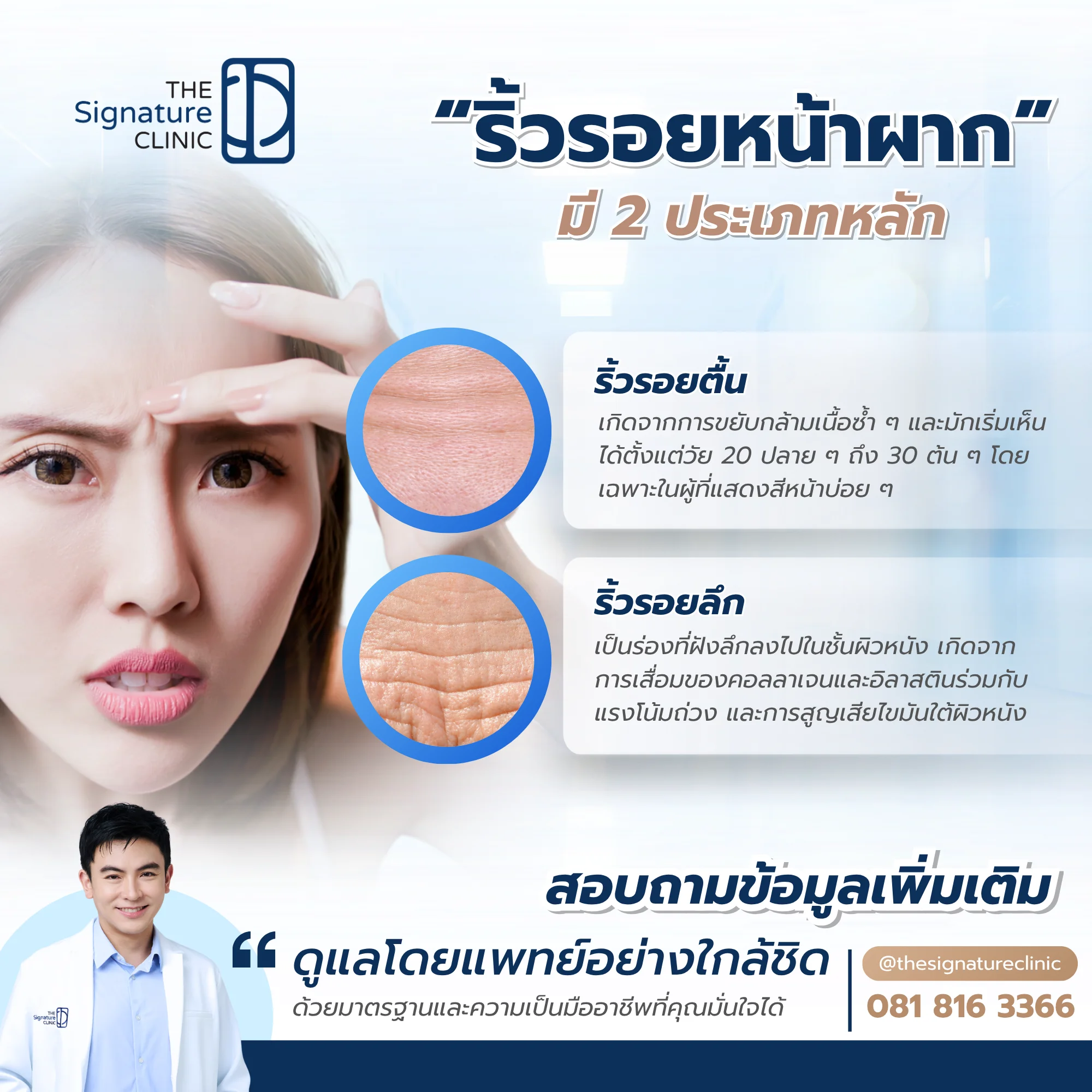 ริ้วรอยหน้าผาก เป็นหนึ่งในปัญหาที่หลายคนเผชิญเมื่ออายุมากขึ้น ไม่เพียงแต่ส่งผลต่อความมั่นใจ ยังอาจทำให้ใบหน้าดูเหนื่อยล้าและมีอายุได้อย่างเห็นได้ชัด การดูแลรักษารอยหน้าผากที่เหมาะสมสามารถช่วยให้ผิวดูเต่งตึงและอ่อนเยาว์ยิ่งขึ้น The Signature Clinic ให้บริการดูแลและฟื้นฟูปัญหาริ้วรอยหน้าผากด้วยวิธีที่ปลอดภัยและเหมาะสมกับแต่ละบุคคล