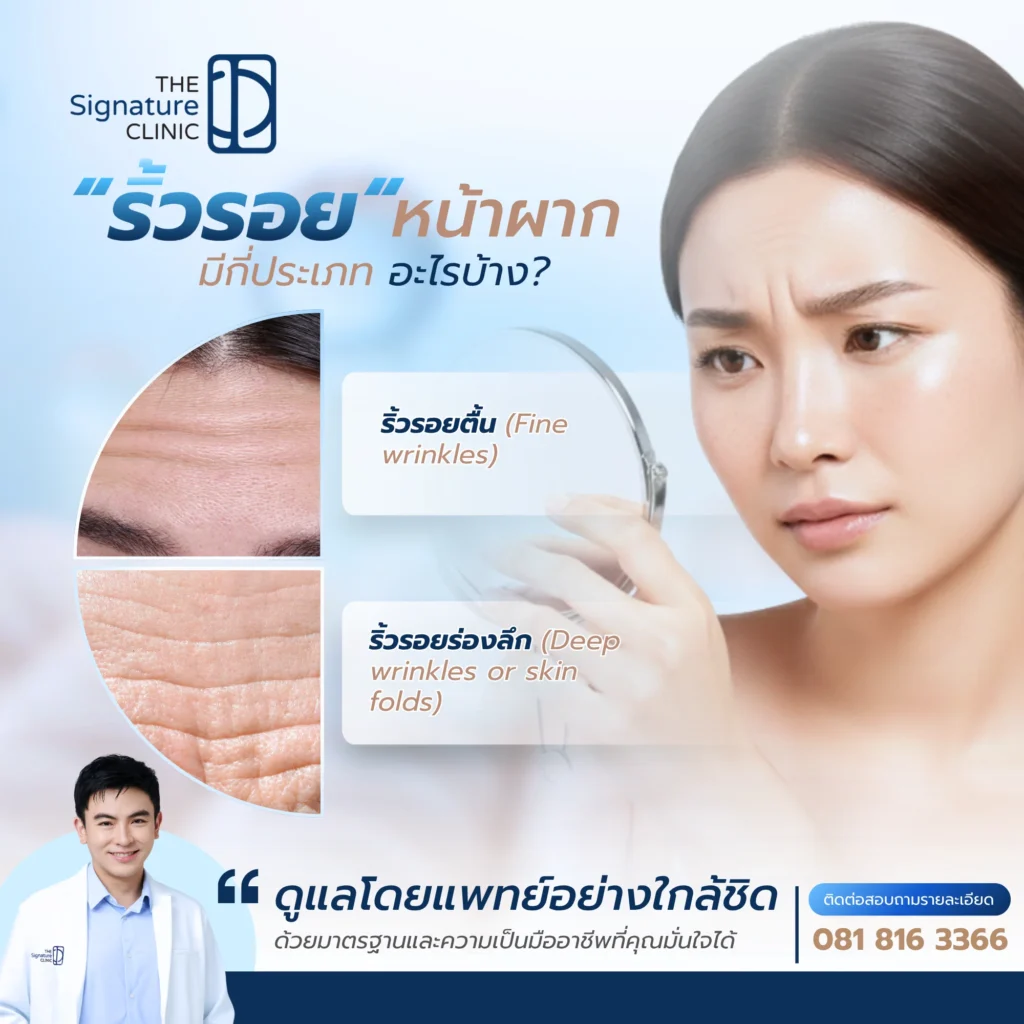 ริ้วรอยบนใบหน้าแบ่งได้หลักๆ 2 ประเภท คือ ริ้วรอยตื้น (Fine Wrinkles) ที่อยู่บนผิวชั้นบน ซึ่งมักเกิดจากผิวแห้ง และริ้วรอยร่องลึก (Deep Wrinkles) ที่เกิดจากการสูญเสียคอลลาเจนและการทำงานของกล้ามเนื้อ