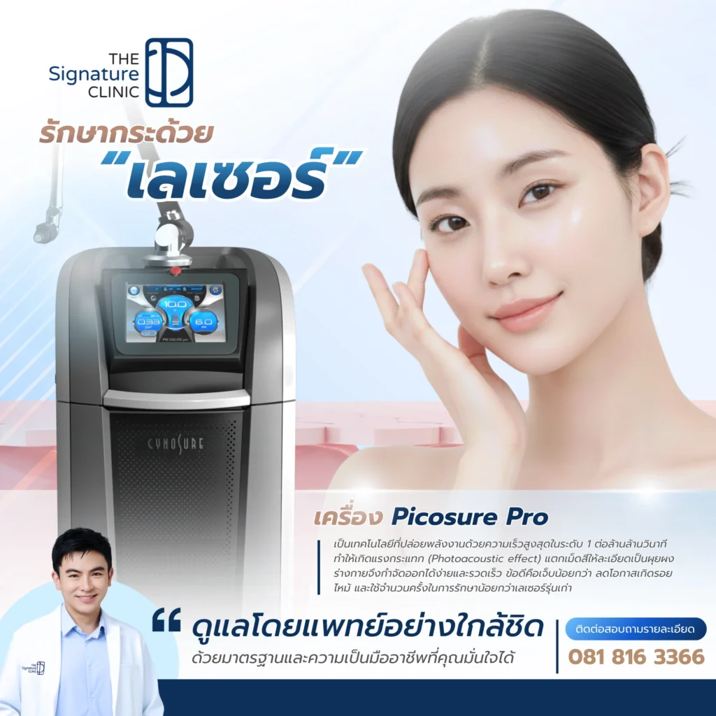 - ความมั่นใจที่ The Signature Clinic: มั่นใจในผลลัพธ์และความปลอดภัยด้วยเครื่องมือ Picosure Pro ของแท้มาตรฐาน US FDA ดูแลโดยทีมแพทย์ระดับ Medical Trainer ที่วิเคราะห์ปัญหาผิวได้ตรงจุด