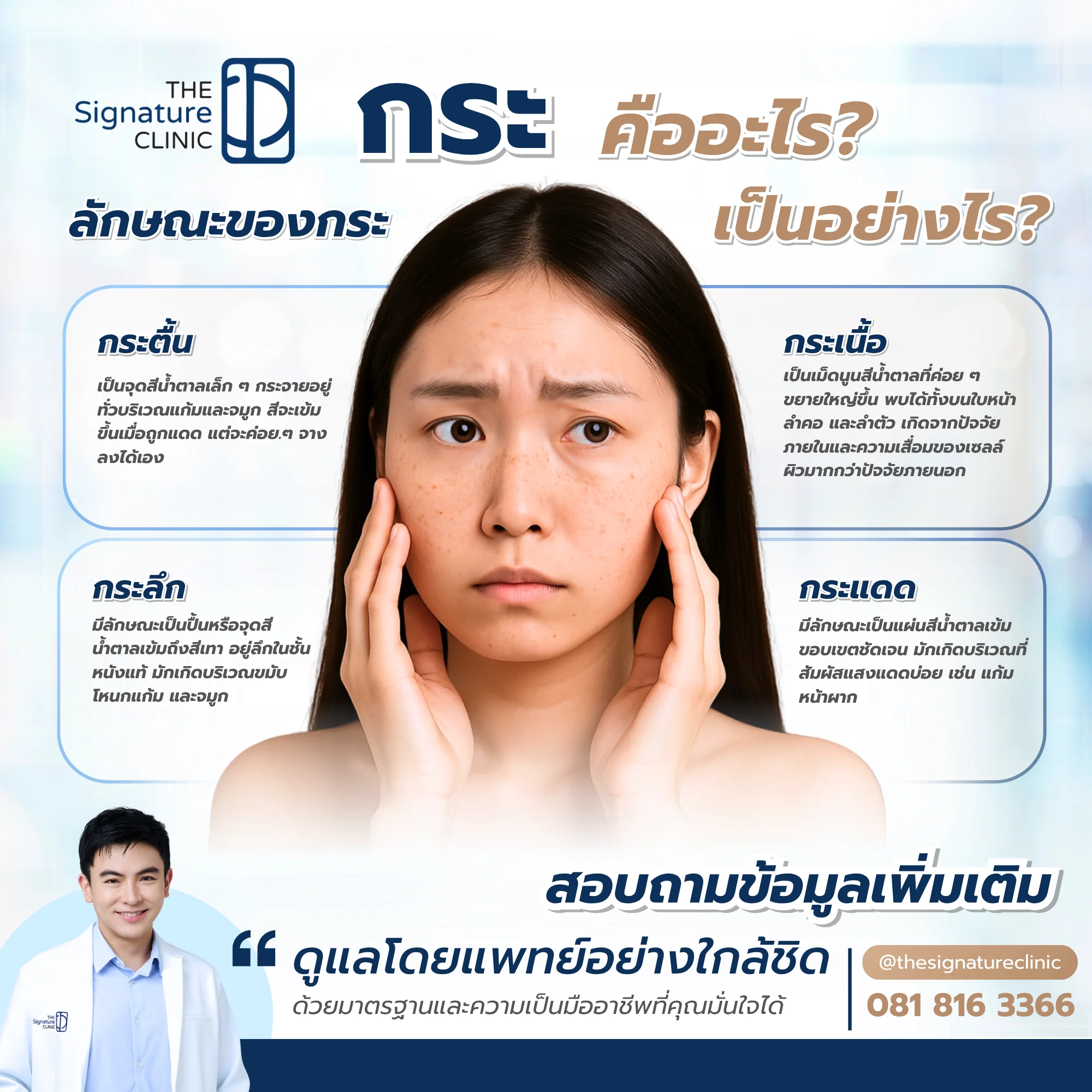 การรักษากระให้จางหรือลดเลือนลงเป็นความต้องการของใครหลายคน เพื่อให้มีผิวที่มีสภาพดีขึ้น ไร้ความกังวลใจ ปัจจุบันมีวิธีการรักษาหลายแบบที่ได้ผลดี โดยเฉพาะการรักษากระบน ใบหน้าด้วยเลเซอร์กระประเภทต่างๆที่ The Signature Clinic คุณจะได้รับการดูแลจากแพทย์ผู้ให้บริการด้วยนวัตกรรมเทคโนโลยีขั้นสูงอย่าง Picosure Pro ที่ช่วยกำจัดกระได้ตรงจุด พร้อมบำรุงผิวให้เปล่งปลั่งอย่างปลอดภัย ควบคู่ไปกับการปรับพฤติกรรมและการดูแลผิวที่ถูกวิธี เพื่อป้องกันไม่ให้กระกลับมาเป็นอีก