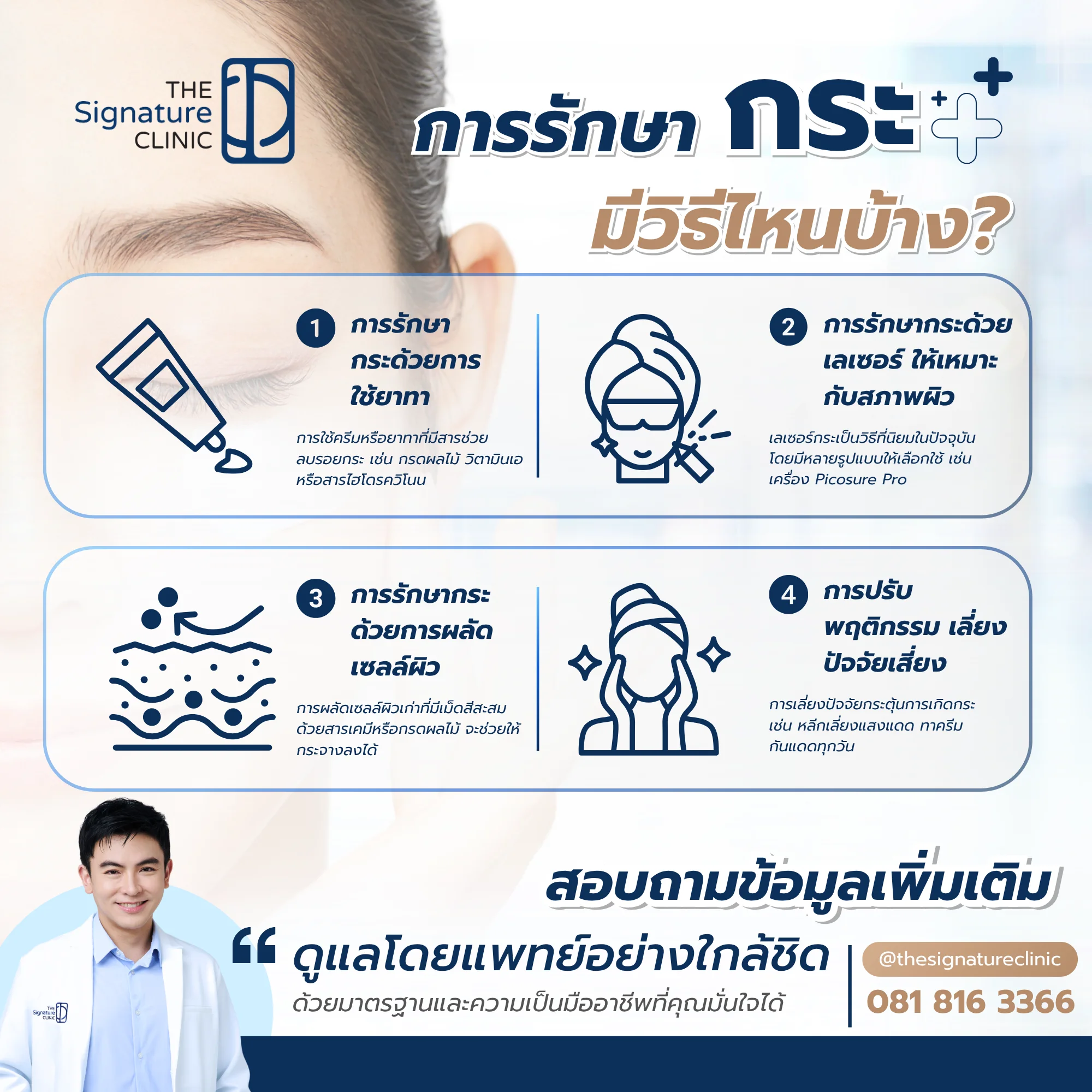 The Signature Clinic รักษากระด้วยวิธีที่หลากหลาย ไม่ว่าจะเป็นเลเซอร์กระ ที่ช่วยสลายเม็ดสีส่วนเกินให้แตกตัวออกจากชั้นผิว การใช้ยาและครีมเพื่อกำจัดกระ การผลัดเซลล์ผิวให้ผิวหน้ามีสภาพดีขึ้น รวมถึงการปรับพฤติกรรมให้ห่างไกลจากปัจจัยกระตุ้น เช่น แสงแดด ความเครียด หรือการบำรุงผิวไม่เหมาะสม เพียงปฏิบัติตามอย่างต่อเนื่องกระจะค่อยๆจางหายไปในที่สุด ทำให้ผิวมีสภาพที่ดีขึ้น เต็มไปด้วยความมั่นใจ