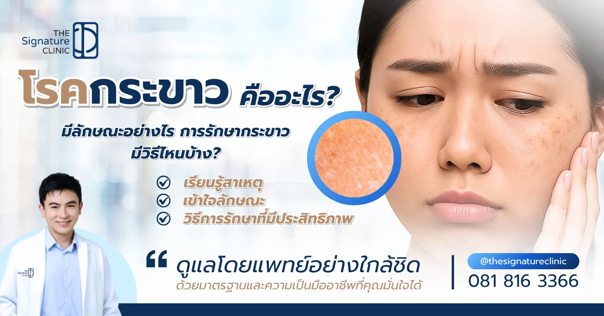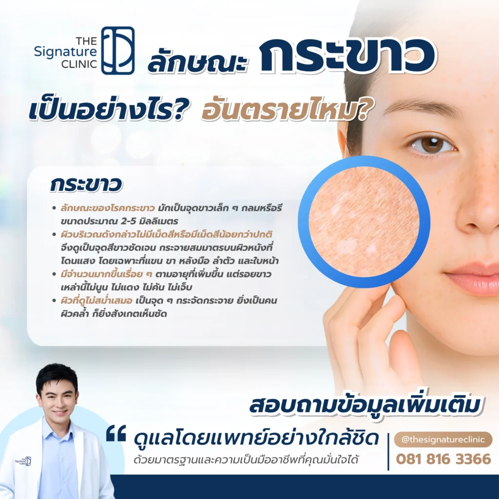 กระขาวก่อให้เกิดความกังวลใจต่อผู้ที่พบเห็น จุดขาว ๆ เล็ก ๆ บนผิวหนัง โดยเฉพาะบริเวณแขน ขา ลำตัว หลายคนสงสัยว่ากระขาวคืออะไร เกิดจากสาเหตุอะไร จะส่งผลเสียต่อร่างกายหรือไม่ และจะรักษากระขาวอย่างไร ที่ The Signature Clinic เราพร้อมให้คำแนะนำและดูแลคุณอย่างใกล้ชิด ด้วยเทคโนโลยีการรักษากระขาว เพื่อช่วยลดเลือนกระขาวบนผิวของคุณ