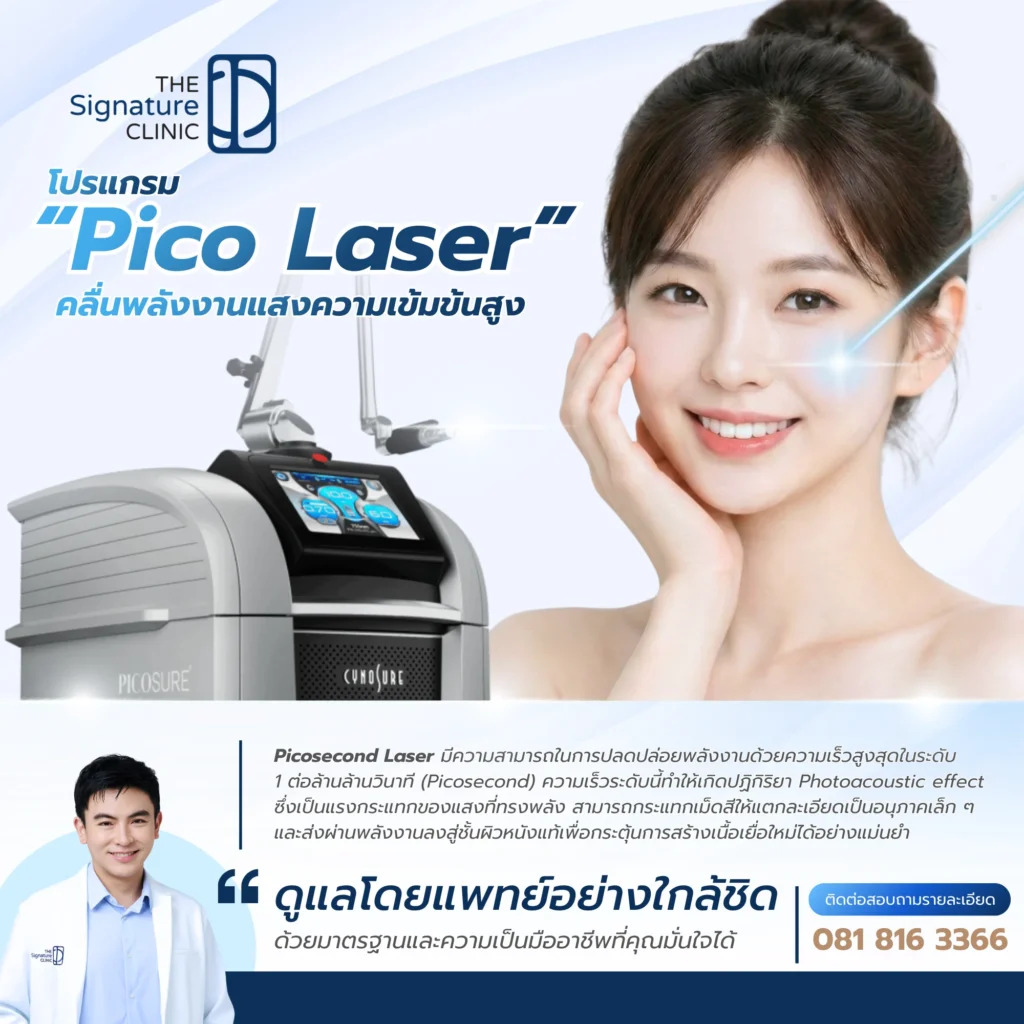 การแก้ไขปัญหาผิวพรรณ ที่ The Signature Clinic คือการมอบความไว้วางใจให้กับทีมแพทย์ระดับอาจารย์ผู้สอน (Medical Trainer) ที่ได้รับการยอมรับในวงการ ในฐานะ Cynosure Signature Partner แห่งเดียวที่ใช้เทคโนโลยี Picosure Pro เครื่องแท้มาตรฐาน US FDA พร้อมหัวเลนส์พิเศษ Platinum Focus™ ที่ช่วยจัดการ เลเซอร์ลบรอยดำ และ เลเซอร์รอยสิว ได้อย่างแม่นยำและนุ่มนวล ลดความเสี่ยงต่อผิว และมอบผลลัพธ์ผิวที่เรียบเนียนกระจ่างใสอย่างเป็นธรรมชาติ ภายใต้การดูแลที่ใส่ใจในทุกรายละเอียดโดยไม่มีการกดดันขายคอร์ส เพื่อให้ผู้รับบริการมั่นใจในความคุ้มค่าและปลอดภัยสูงสุด