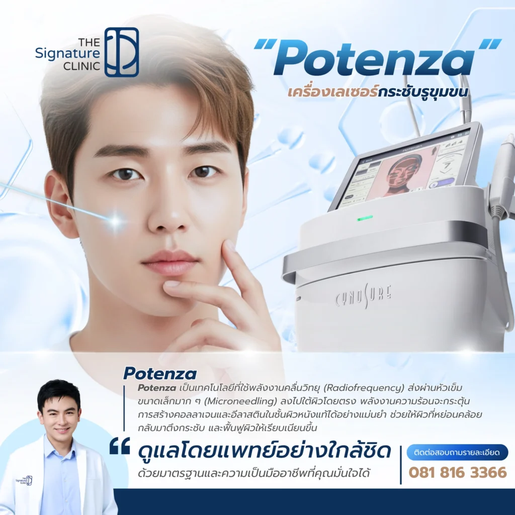 Potenza เป็นเทคโนโลยีที่ใช้พลังงานคลื่นวิทยุ (Radiofrequency) ส่งผ่านหัวเข็มขนาดเล็กมากๆ (Microneedling) ลงไปใต้ผิวโดยตรง พลังงานความร้อนจะกระตุ้นการสร้างคอลลาเจนและอีลาสตินในชั้นผิวหนังแท้ได้อย่างแม่นยำ ช่วยให้ผิวที่หย่อนคล้อยกลับมาตึงกระชับ และฟื้นฟูผิวให้เรียบเนียนขึ้น