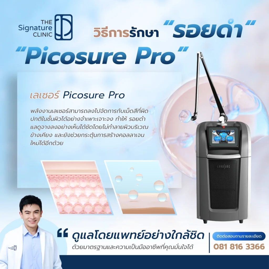 เลเซอร์ในกลุ่ม Picosecond Laser เช่น Picosure Pro เป็นตัวเลือกที่นิยมมากในการรักษารอยดำ เนื่องจากสามารถทำให้เม็ดสีแตกตัวได้ดีโดยเกิดผลกระทบต่อผิวข้างเคียงน้อย
