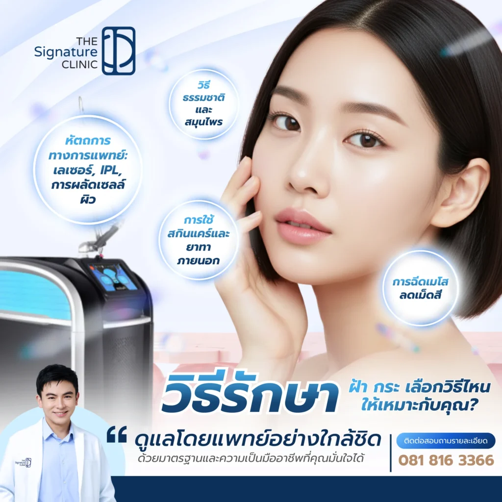 ที่ The Signature Clinic เราเข้าใจดีว่าปัญหาผิวของแต่ละบุคคลมีความซับซ้อน เราจึงไม่ใช้สูตรสำเร็จในการรักษา แต่เน้นการวิเคราะห์ปัญหาผิวอย่างละเอียดโดยทีมแพทย์ที่มีความชำนาญการระดับ “Medical Trainer” พร้อมด้วยเทคโนโลยีระดับโลกอย่าง Picosure Pro จาก Cynosure (USA) ซึ่งเราได้รับเกียรติเป็น Signature Partner เพื่อให้มั่นใจว่าทุกการรักษาจะให้ผลลัพธ์ที่มีประสิทธิภาพ ปลอดภัย และดูเป็นธรรมชาติที่สุด โดยไม่ต้องกังวลเรื่องผลข้างเคียงจากเครื่องมือที่ไม่ได้มาตรฐาน หากคุณยังไม่แน่ใจว่าปัญหาผิวของคุณคือฝ้าหรือกระ และควรเริ่มต้นรักษาอย่างไร การเข้ามาปรึกษาแพทย์เพื่อรับการวินิจฉัยที่แม่นยำคือทางเลือกที่ดีที่สุด