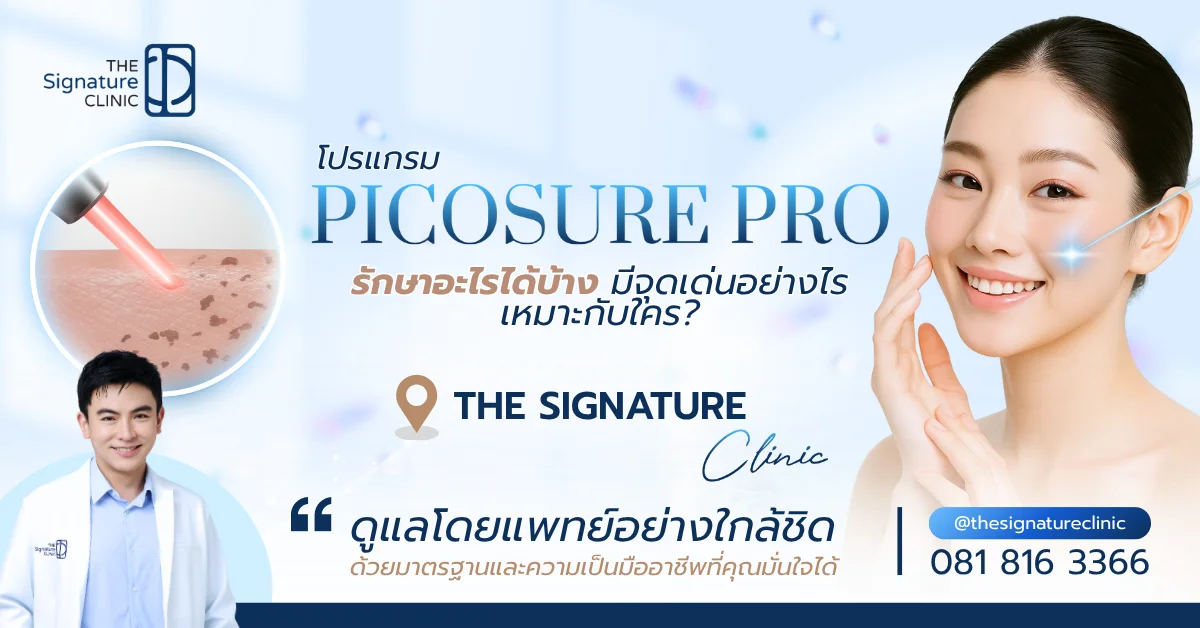 Picosure Pro รักษา ได้ครอบคลุมทั้งปัญหาเม็ดสี รอยดำ รอยแผลเป็น กระ และฝ้า โดยไม่ต้องพักฟื้นนาน เหมาะกับทุกสภาพผิวและผู้ที่ต้องการผลลัพธ์ที่แม่นยำ ปลอดภัย และเห็นการเปลี่ยนแปลงชัดเจน The Signature Clinic พร้อมให้บริการ โปรแกรม Picosure Laser โดยแพทย์ที่มีความชำนาญ ให้คำปรึกษาเฉพาะราย และใช้อุปกรณ์ที่ผ่านมาตรฐานสากล เพื่อผลลัพธ์ที่คุณมั่นใจได้
