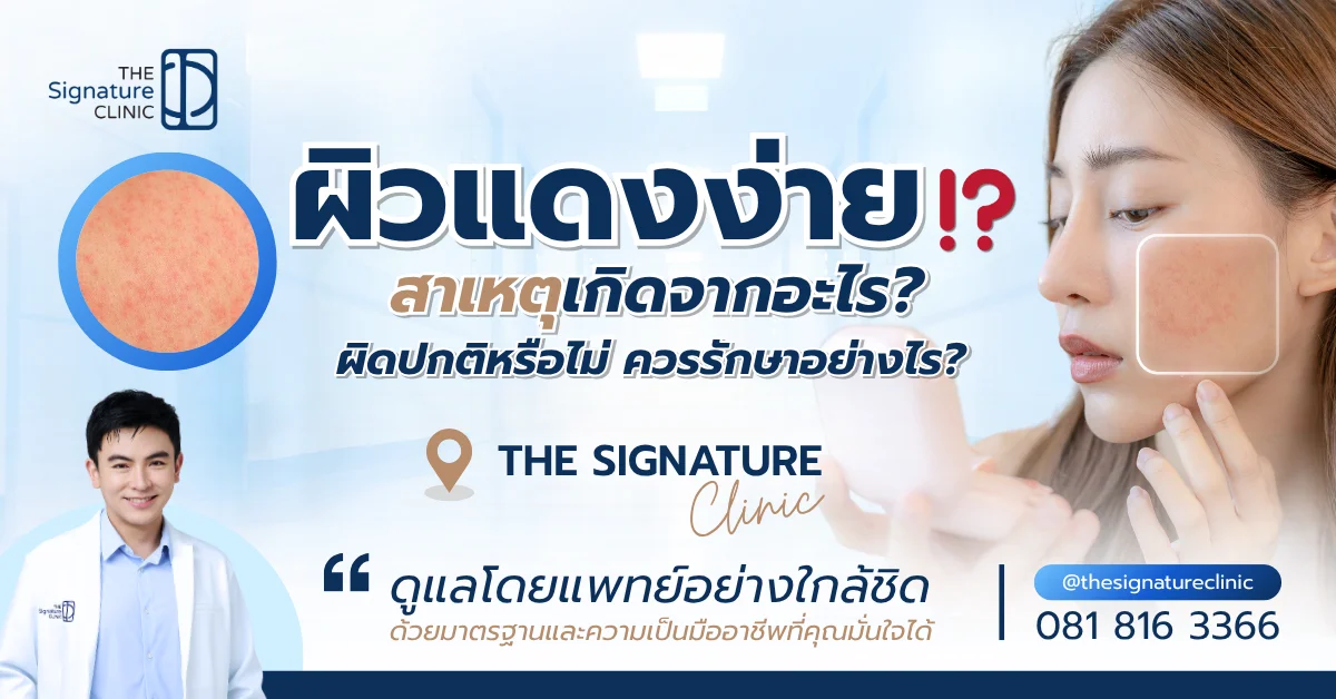 ผิวแดงง่าย เป็นปัญหาผิวที่หลายคนพบเจอและกังวลใจ บางคนอาจจะแค่มีผิวแดงเป็นประจำ แต่สำหรับบางคนอาจแดงง่ายผิดปกติ ทั้งยังมีผื่นแดง คัน ระคายเคืองง่ายอีกด้วย ผิวแดงง่าย อาจบ่งบอกถึงสภาพผิวไม่แข็งแรงหรือเป็นสัญญาณของโรคผิวหนังบางอย่างก็เป็นได้ การดูแลรักษาอย่างเหมาะสมจึงมีความสำคัญ The Signature Clinic เป็นคลินิกผิวพรรณชั้นนำ พร้อมแนะนำสาเหตุและวิธีการรักษาอย่างถูกต้องสำหรับผู้มีปัญหาผิวแดงง่าย
