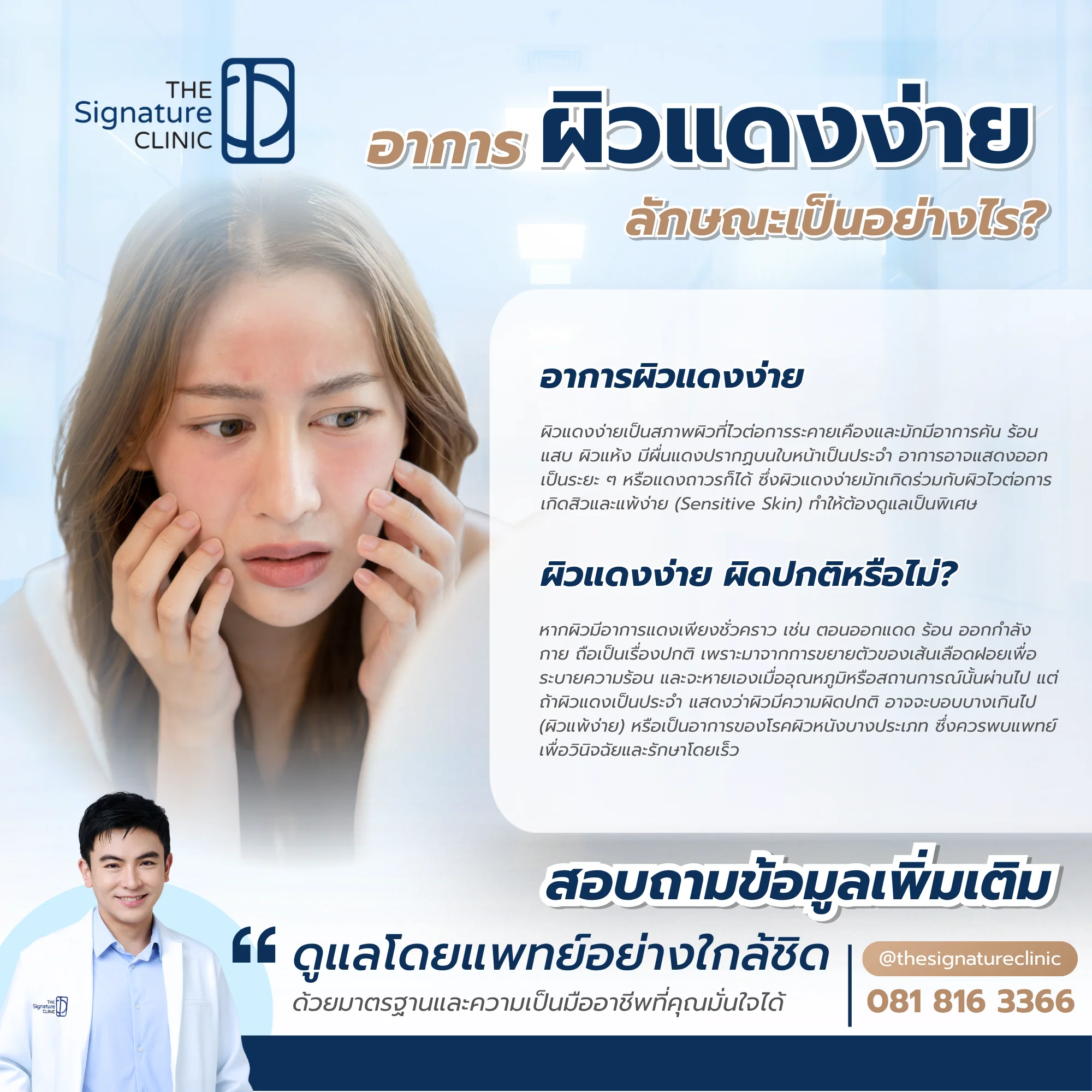 ผิวแดงง่าย เป็นหนึ่งในปัญหาผิวที่หลายคนเผชิญ และมักจะเกิดร่วมกับภาวะผิวแพ้ง่ายหรือผิวบอบบาง ที่ไวต่อการระคายเคืองจากปัจจัยต่าง ๆ ไม่ว่าจะเป็นสภาพอากาศ มลภาวะ ผลิตภัณฑ์ที่ใช้ ตลอดจนปัจจัยทางพันธุกรรมและฮอร์โมน ซึ่งก็อาจทำให้ผิวแดง คัน แสบ แห้ง ลอก จนถึงขั้นเกิดเป็นโรคผิวหนังได้ การดูแลรักษาผิวแดงง่ายและผิวแพ้ง่าย จึงต้องเลือกใช้ผลิตภัณฑ์ที่อ่อนโยน พักผ่อนเพียงพอ ปกป้องผิวจากแสงแดดและความร้อน ควบคู่ไปกับการปรึกษาแพทย์ผิวหนังและเลือกใช้บริการจากคลินิกผิวพรรณชั้นนำอย่าง The Signature Clinic เพื่อแก้ไขปัญหาผิวได้อย่างถูกจุดและได้ผลดีที่สุด