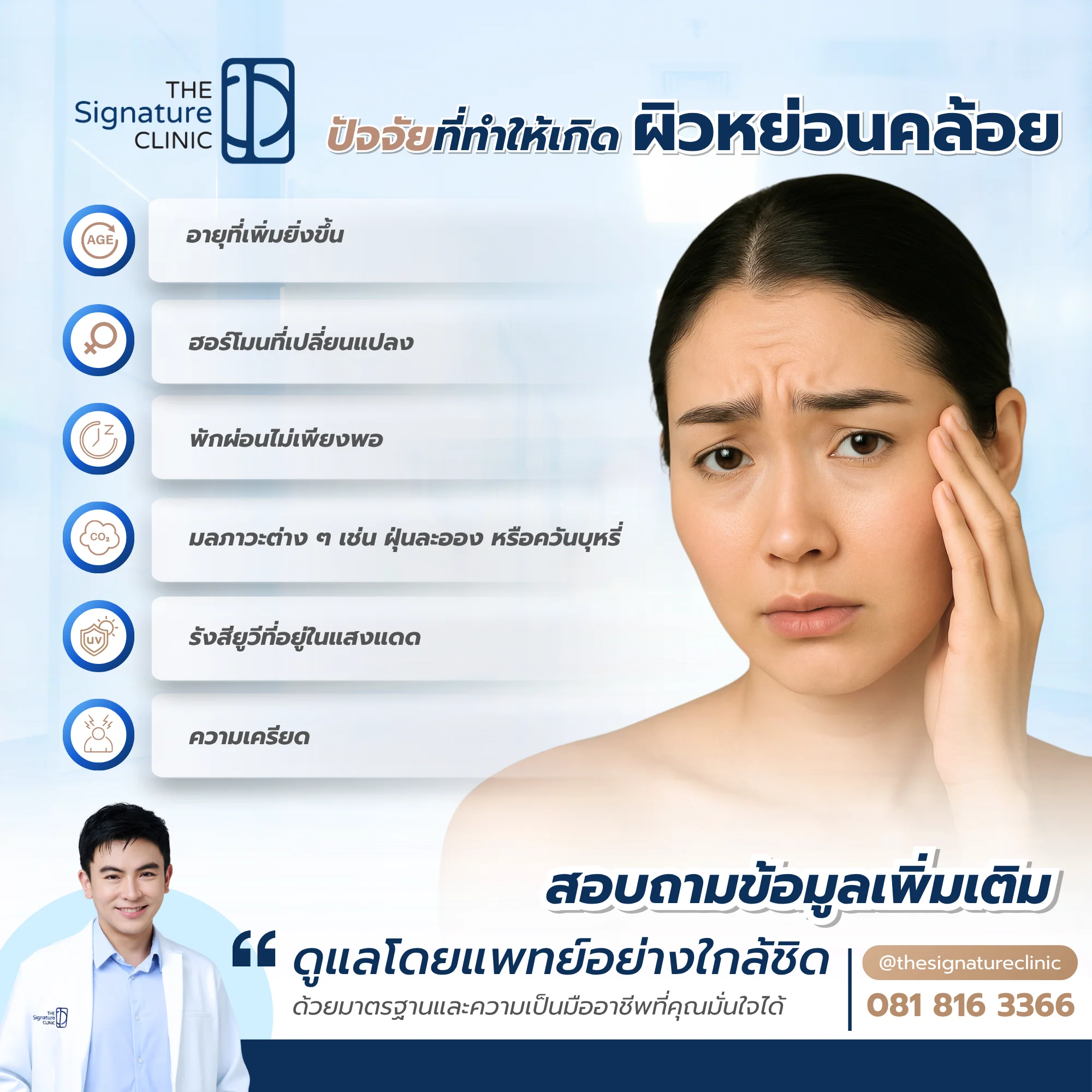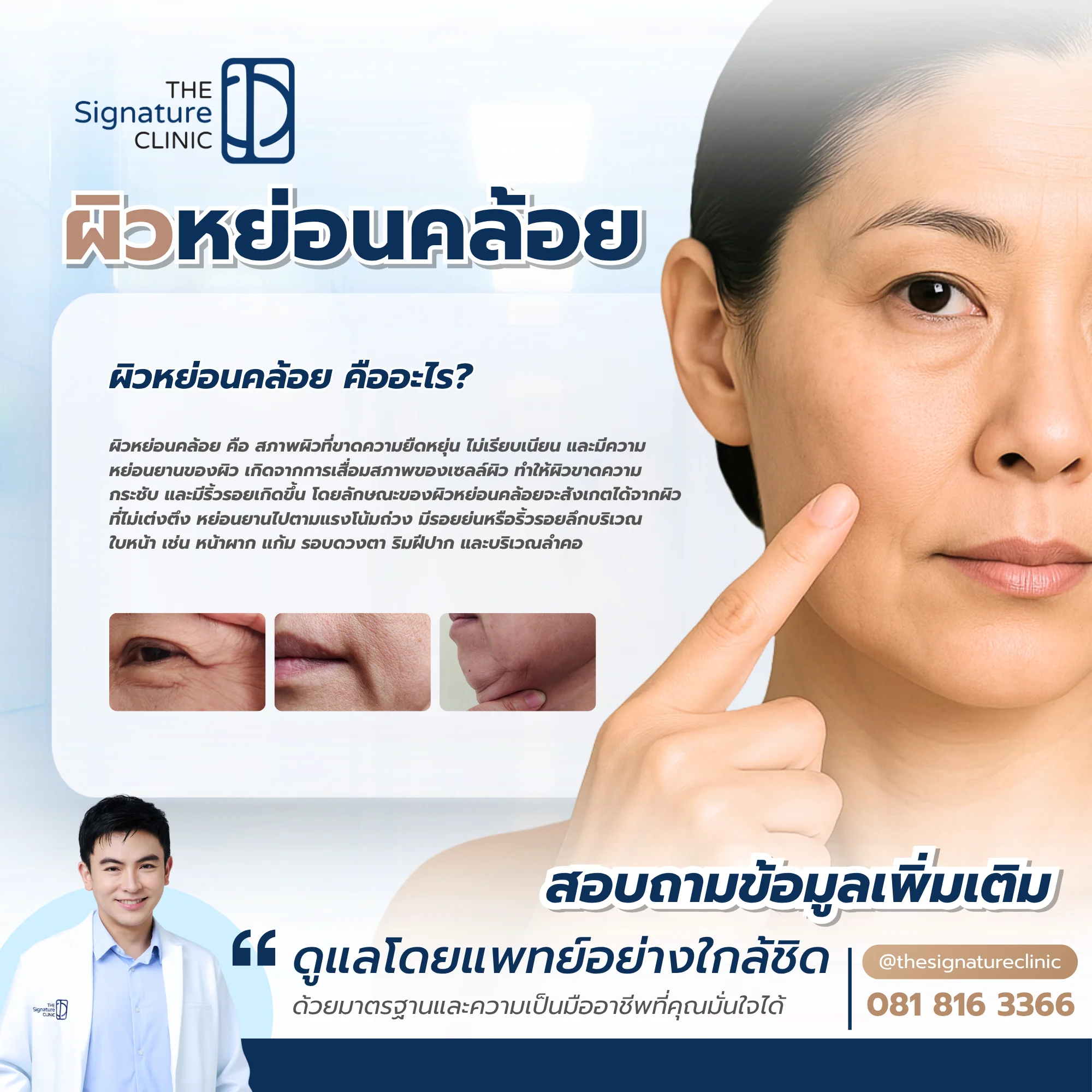 - ปัญหาผิวหย่อนคล้อยที่เกิดในช่วงอายุต่างๆ เริ่มตั้งแต่วัย 20+ ผิวจะมีริ้วรอยบางๆ, 30+ ริ้วรอยชัดขึ้น ผิวเริ่มไม่กระชับ, 40+ ริ้วรอยลึก ไขมันใต้ผิวลดลงทำให้ผิวยุบตัว และ 50+ ริ้วรอยลึกชัดเจน รูปหน้าเปลี่ยนแปลงไปจากเดิม