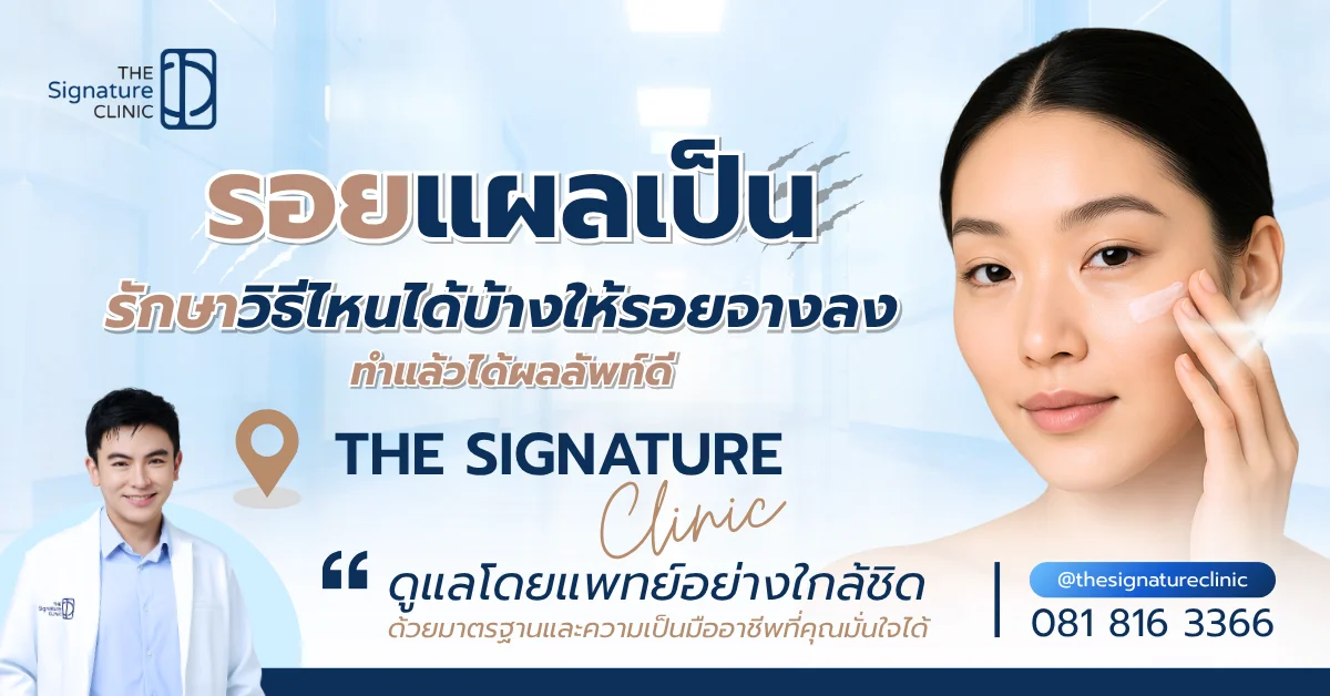 รอยแผลเป็น เป็นปัญหาผิวที่พบได้บ่อยและส่งผลต่อความมั่นใจของหลายคน ปัจจุบันมีวิธีดูแลและรักษาหลากหลายที่ช่วยให้รอยจางลงอย่างปลอดภัย ภายใต้การดูแลของผู้เชี่ยวชาญด้านผิวหนัง การเลือกวิธีที่เหมาะสมกับสภาพแผลและผิวของแต่ละบุคคลจึงเป็นสิ่งสำคัญ บริการของ The Signature Clinic พร้อมให้คำแนะนำและแนวทางที่เหมาะสมในการดูแลรอยแผลเป็นอย่างมืออาชีพ
