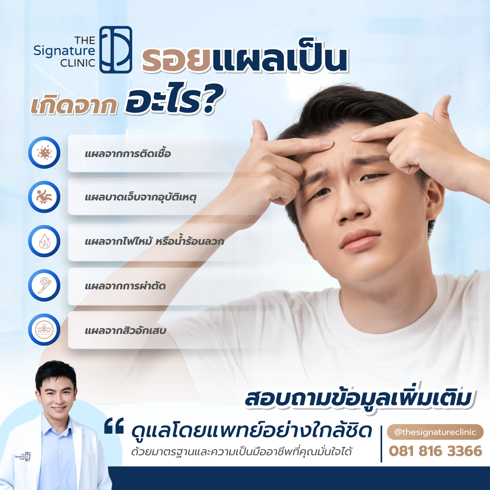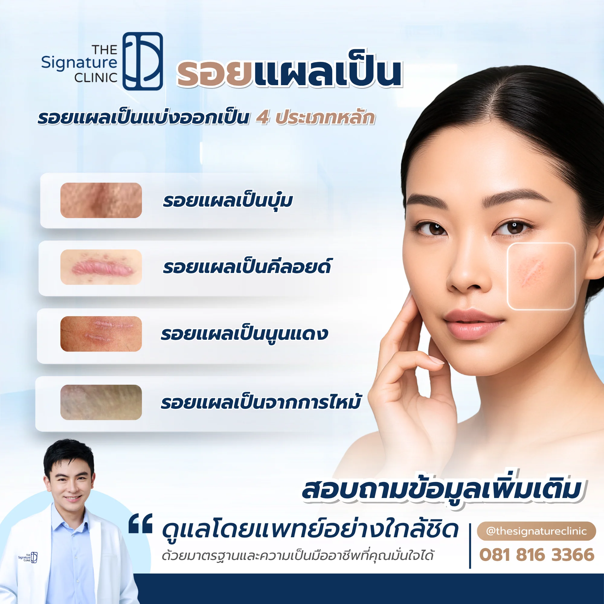 รอยแผลเป็นอาจเกิดจากหลายสาเหตุและมีรูปแบบที่หลากหลาย การเลือกรักษาควรพิจารณาอย่างรอบคอบและอยู่ภายใต้การดูแลของผู้เชี่ยวชาญ The Signature Clinic พร้อมดูแลปัญหาผิวอย่างเข้าใจ ด้วยเทคโนโลยีที่ทันสมัยและการบริการแบบครบวงจร ให้คุณกลับมามั่นใจในผิวของตัวเองได้อีกครั้ง