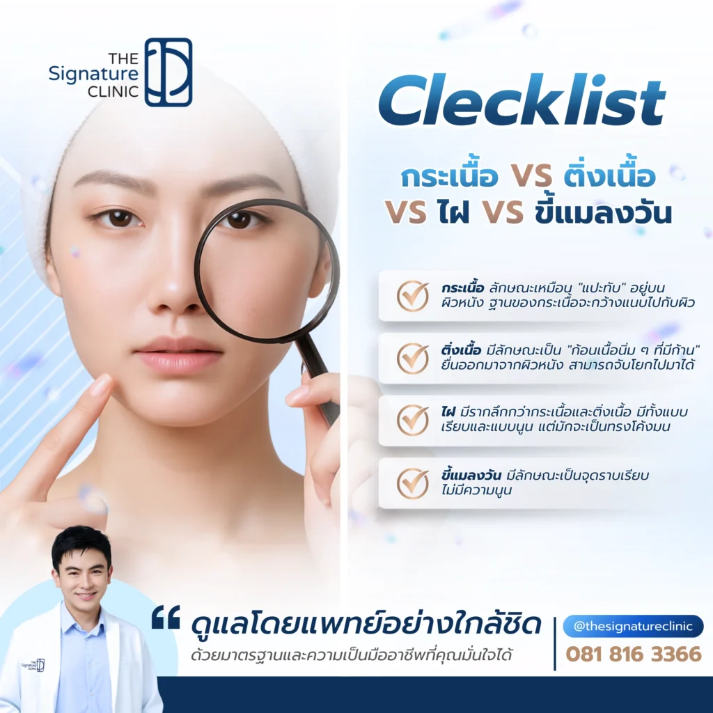 คำแนะนำจาก The Signature Clinic: แม้ตารางนี้จะช่วยแยกแยะเบื้องต้นได้ แต่ในบางกรณี รอยโรคอาจมีความซับซ้อน หากไม่แน่ใจ ไม่ควรพยายามกำจัดด้วยตัวเอง ควรให้แพทย์ผู้มีประสบการณ์ตรวจวินิจฉัยเพื่อความปลอดภัย
