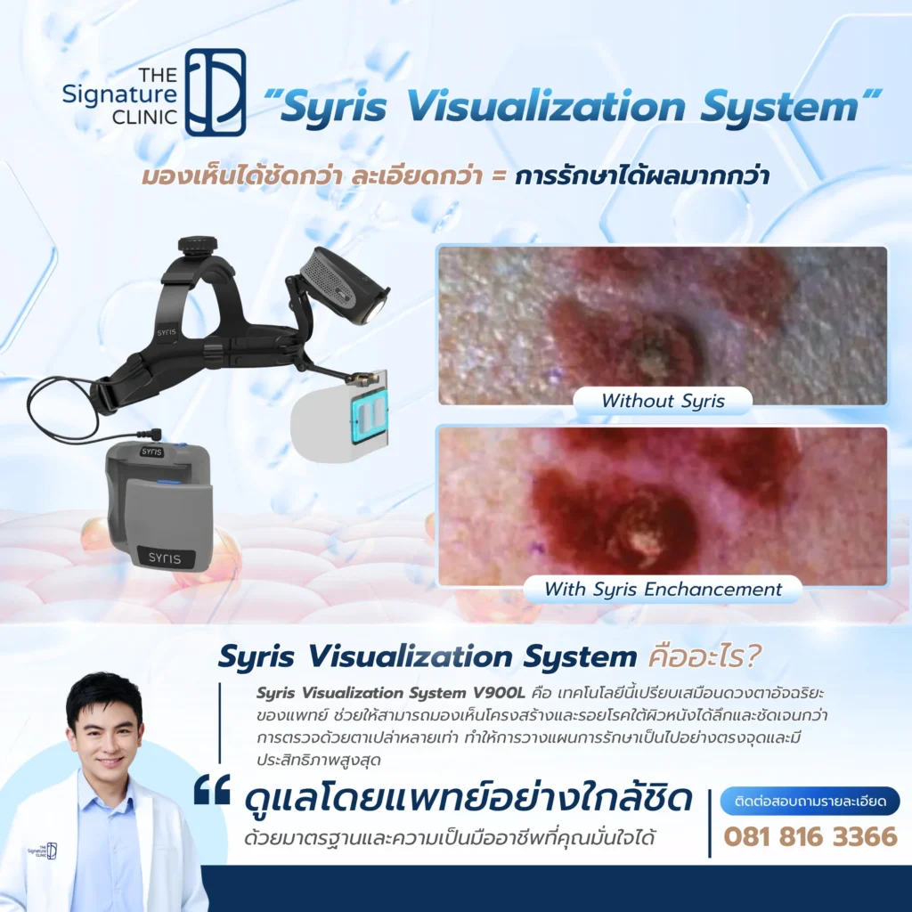 การลงทุนในเทคโนโลยี Syris Visualization System สะท้อนถึงค่านิยมหลักของ The Signature Clinic ที่ยึดมั่นในความปลอดภัย (Safety First) และความชำนาญการ (Expertise) อย่างแท้จริง เราเชื่อว่าผลลัพธ์การรักษาที่ดีไม่ได้เริ่มต้นที่เครื่องมือที่ดีที่สุดเท่านั้น แต่ต้องเริ่มจากการวินิจฉัยที่ถูกต้องที่สุดเสียก่อน การใช้เครื่องมือนี้จึงเป็นเครื่องยืนยันถึงความใส่ใจและความมุ่งมั่นของเราที่จะมอบการดูแลที่มีคุณภาพสูงสุด เพื่อให้คุณมั่นใจได้ว่าทุกขั้นตอนการรักษาถูกวางแผนมาอย่างดีที่สุดสำหรับผิวของคุณโดยเฉพาะ