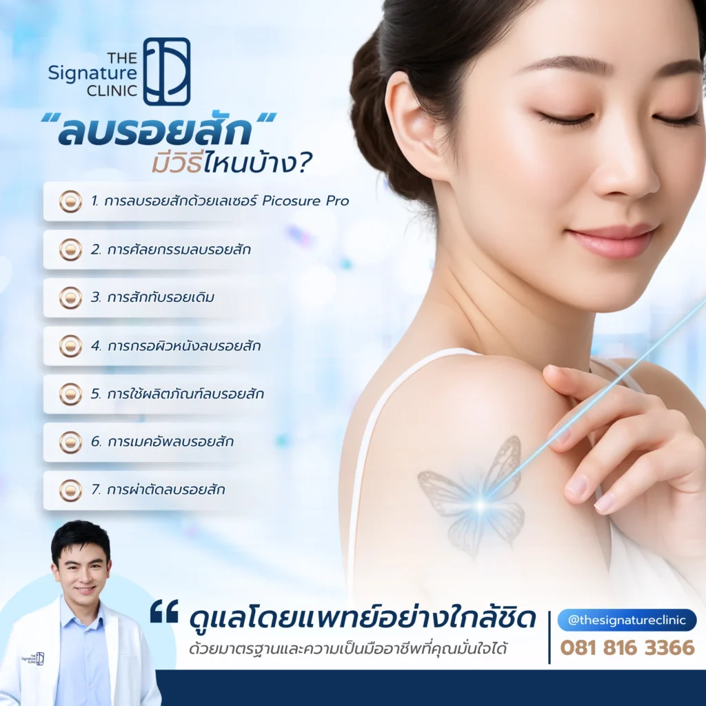 ลบรอยสักเป็นหนึ่งในความต้องการที่เพิ่มขึ้นอย่างต่อเนื่อง ทั้งในกลุ่มผู้ที่ต้องการปรับภาพลักษณ์หรือเปลี่ยนแปลงเส้นทางชีวิต การเลือกใช้บริการจากคลิกนิกที่เชื่อถือได้ จึงมีความสำคัญ เพราะการลบรอยสักไม่ได้มีเพียงวิธีเดียว แต่มีหลากหลายเทคนิคที่ให้ผลลัพธ์แตกต่างกัน ทั้งการใช้เลเซอร์รอยสัก ศัลยกรรม การกรอผิว หรือแม้กระทั่งการปกปิดด้วยเมคอัพ โดยเฉพาะอย่างยิ่งเทคโนโลยีเลเซอร์ Picosure Pro ที่เรา The Signature Clinic ใช้ ถือเป็นหนึ่งในเครื่องลบรอยสักที่ได้รับการยอมรับว่าให้ผลลัพธ์ที่มีประสิทธิภาพโดยอยู่ภายใต้การดูแลของแพทย์ผู้ชำนาญการอย่างใกล้ชิด
