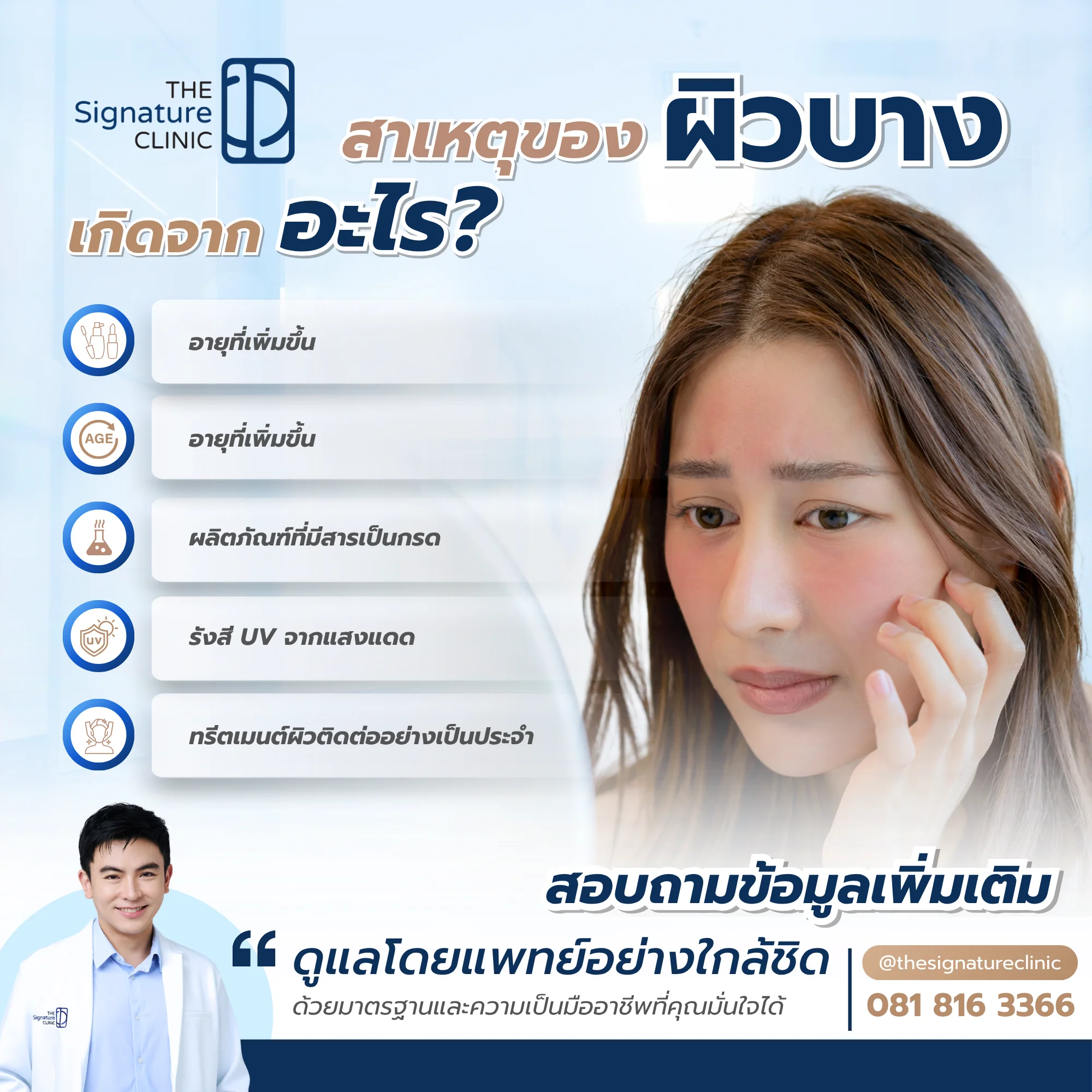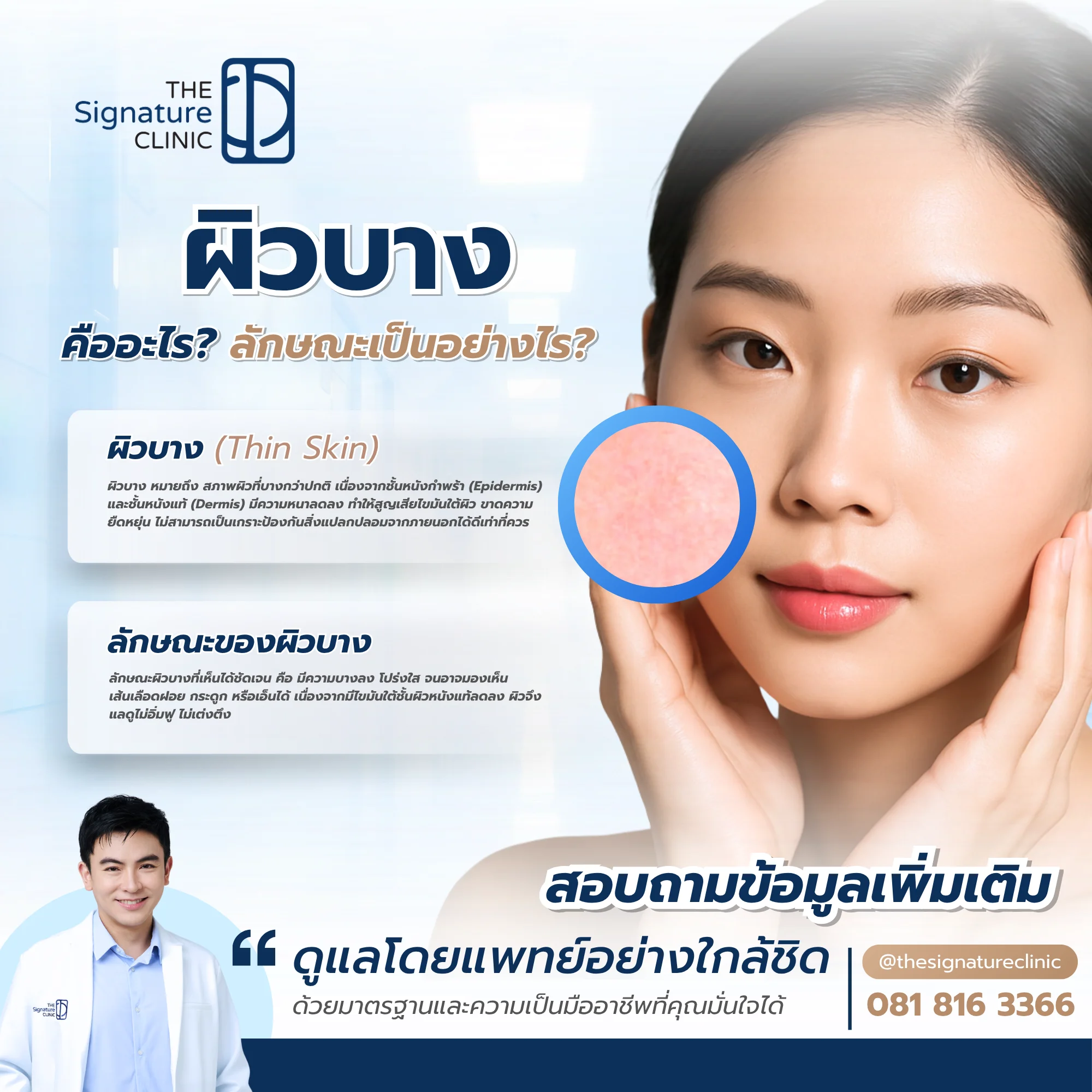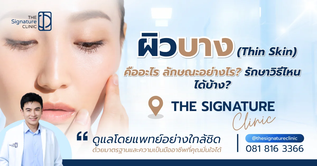 ผิวบาง เป็นปัญหาผิวที่มาพร้อมความกังวลใจ เพราะนอกจากจะทำให้ผิวแลดูโทรม ไม่สุขภาพดีแล้ว ยังส่งผลต่อความมั่นใจในตัวเองอีกด้วย ดังนั้นการรู้จักสาเหตุ ปัจจัยเสี่ยงและวิธีป้องกันจะช่วยไม่ให้เกิดปัญหาผิวบางได้ แต่ถ้าหากมีสัญญาณของผิวบางเกิดขึ้นแล้ว การเข้าพบและปรึกษาแพทย์ผิวหนังผู้เชี่ยวชาญก็ถือเป็นทางออกที่ดีในการฟื้นฟูผิวบาง ให้กลับมาแข็งแรง สวยใส เต่งตึงเหมือนเดิม ซึ่ง The Signature Clinic พร้อมให้บริการดูแลรักษาผิวบางอย่างครบวงจร ด้วยเทคโนโลยีล้ำสมัย เพื่อคุณภาพผิวที่ดีที่สุด