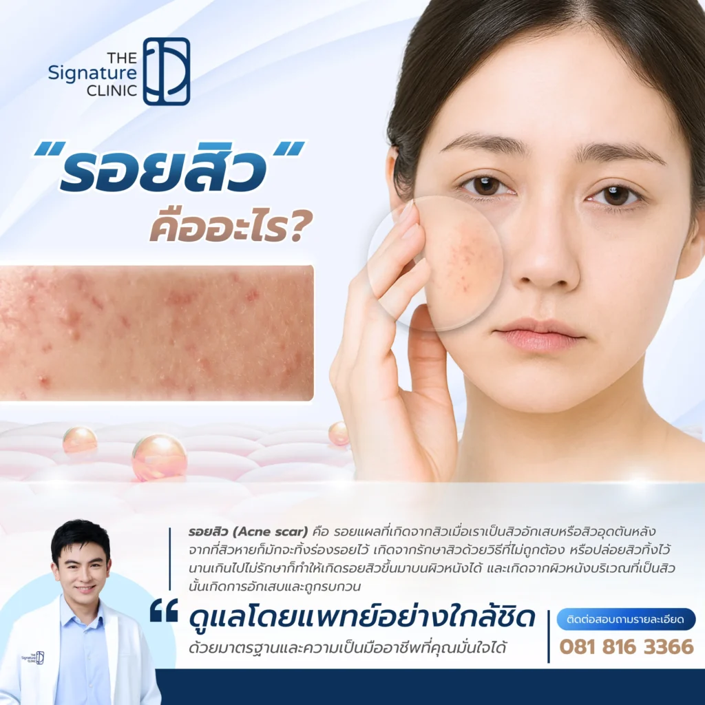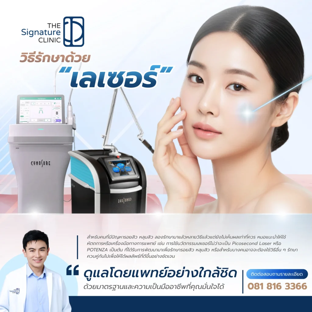 - The Signature Clinic มีเทคโนโลยีและทีมแพทย์เชี่ยวชาญที่วางแผนการรักษารอยสิวเฉพาะบุคคล เน้นความปลอดภัยและผลลัพธ์ที่ตอบโจทย์ทุกปัญหาผิว