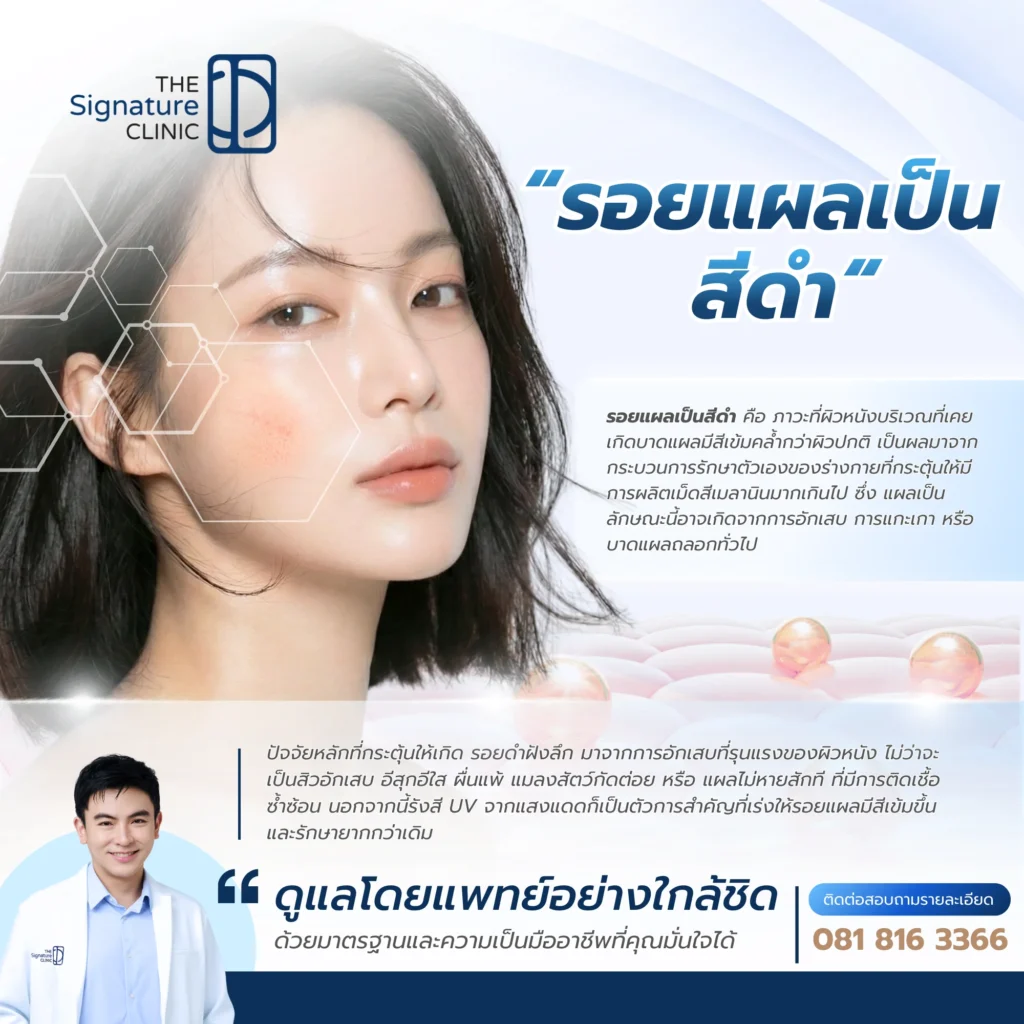 ปัญหาผิวพรรณที่สร้างความกังวลใจให้ใครหลายคน คงหนีไม่พ้น “รอยแผลเป็นสีดำ” ที่หลงเหลือไว้หลังจากแผลหายดีแล้ว ไม่ว่าจะเป็นรอยจากสิว อุบัติเหตุ หรือรอยขีดข่วนเล็กน้อย รอยคล้ำเหล่านี้บั่นทอนความมั่นใจและทำให้ผิวดูไม่สม่ำเสมอ บทความนี้ The Signature Clinic จะพามาทำความเข้าใจกลไกการเกิดรอยดำ เพื่อให้คุณเลือกวิธีรับมือได้อย่างถูกต้องและปลอดภัย