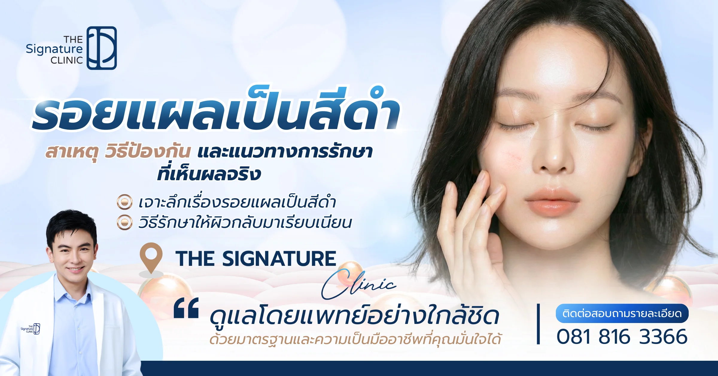 การรักษารอยแผลเป็นสีดำไม่ใช่แค่การยิงเลเซอร์ให้จบไป แต่ต้องอาศัยการวิเคราะห์สภาพผิวและความลึกของเม็ดสีอย่างแม่นยำ ที่ The Signature Clinic เรายึดมั่นในค่านิยม Safety First และ Expertise ดูแลโดยทีมแพทย์ที่มีความชำนาญการ นำโดย นพ.ภูริวัจน์ อริยกุศลสุทธิ (หมอบอล) ซึ่งเป็นถึง Official Medical Trainer ที่ได้รับความไว้วางใจให้เป็นผู้ฝึกสอนแพทย์ท่านอื่น เราเลือกใช้เครื่อง Picosure Pro แท้ที่ได้มาตรฐานระดับโลกจาก Cynosure (USA) ในฐานะ Cynosure Signature Partner ทำให้มั่นใจได้ว่าคุณจะได้รับการรักษาด้วยเทคโนโลยีที่มีประสิทธิภาพสูงสุดและปลอดภัย เพื่อผลลัพธ์ผิวที่เรียบเนียนใสอย่างเป็นธรรมชาติ โดยไม่ต้องกังวลกับผลข้างเคียงหรือการเลี้ยงไข้ เพราะเราเชื่อว่าผลลัพธ์ที่ดีที่สุด คือลายเซ็นแห่งความสำเร็จของเรา นัดหมายปรึกษาแพทย์เพื่อประเมินการรักษารอยแผลเป็นของคุณ