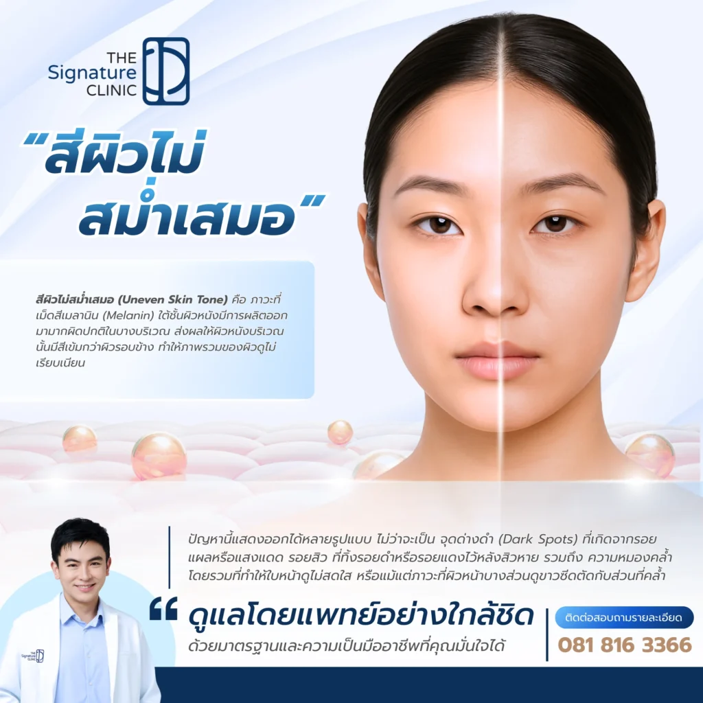 การแก้ไขปัญหาสีผิวไม่สม่ำเสมอ ไม่ใช่แค่การยิงเลเซอร์ให้จบไป แต่คือ “ศิลปะ” ในการวิเคราะห์ปัญหาผิวเฉพาะบุคคล ที่ The Signature Clinic เรายึดมั่นในค่านิยม Safety First และ Expertise ทุกเคสจะได้รับการดูแลโดยทีมแพทย์ระดับอาจารย์ผู้ฝึกสอน (Medical Trainer) พร้อมด้วยเครื่องมือPicosure Pro ของแท้ที่เราได้รับเลือกเป็น Cynosure Signature Partner เราไม่ได้มอบแค่ความขาวใส แต่เรามอบผลลัพธ์ที่ “ปลอดภัย เป็นธรรมชาติ และดูดีที่สุดในแบบของคุณ” เพื่อให้คุณมั่นใจในทุกบทบาทของชีวิต หากคุณกำลังมองหาคำปรึกษาที่จริงใจและเทคโนโลยีที่ไว้ใจได้ สามารถนัดหมายเข้ามาปรึกษาแพทย์ได้โดยตรงคลิกที่นี่เพื่อจองคิวปรึกษาแพทย์
