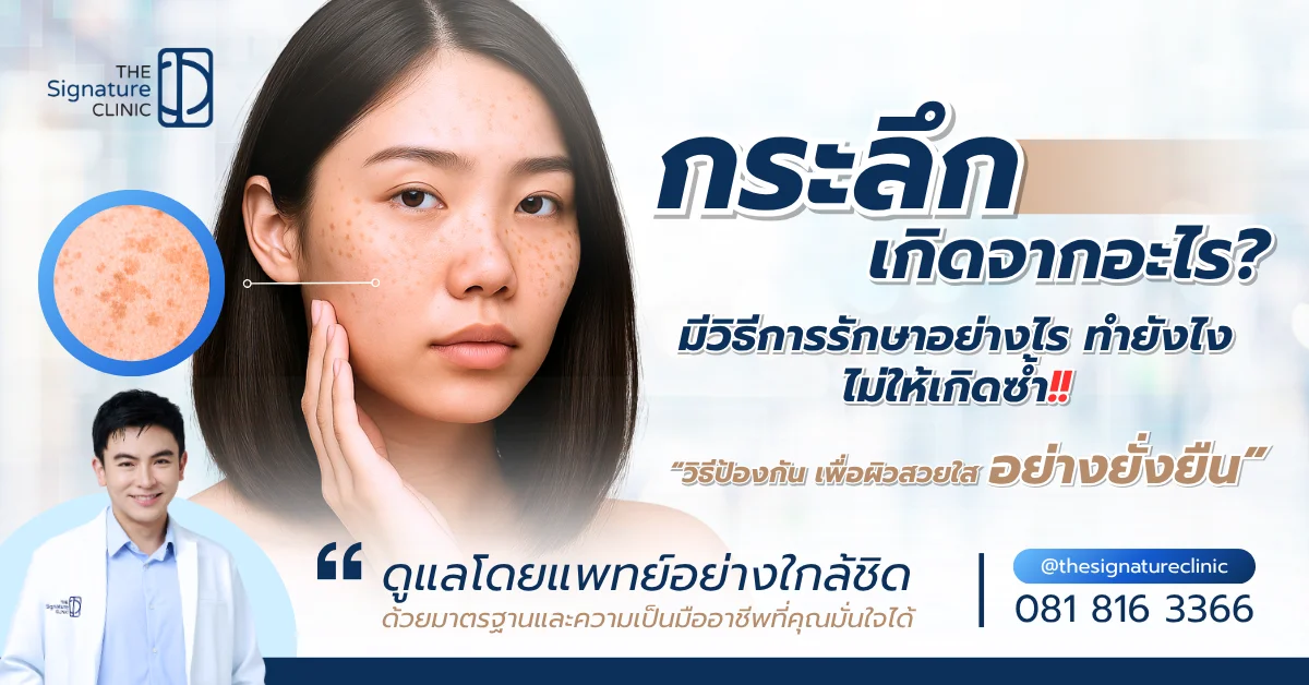 กระลึก เกิดจากความผิดปกติของเม็ดสีเมลานิน โดยมีปัจจัยหลักจากพันธุกรรมและฮอร์โมน รูปแบบการรักษากระลึกนั้นมีหลายวิธี ตั้งแต่การรักษาเฉพาะที่ไปจนถึงการใช้เลเซอร์ แต่ไม่ว่าจะเลือกวิธีไหน ก็ควรทำควบคู่ไปกับการป้องกันแสงแดดและการดูแลผิวที่ถูกต้องเสมอ หากคุณกำลังมองหาคลินิกเฉพาะทางผิวหนังที่น่าเชื่อถือ เพื่อรักษากระลึกด้วยเทคโนโลยีที่ทันสมัยและมีประสิทธิภาพ แนะนำให้เข้ามารับบริการของ The Signature Clinic จากแพทย์ประจำคลินิกผู้ชำนาญการที่พร้อมดูแลคุณอย่างใกล้ชิด ลดปัญหาฝ้า กระ จุดด่างดำ เพื่อผิวสวยใสอย่างมั่นใจ