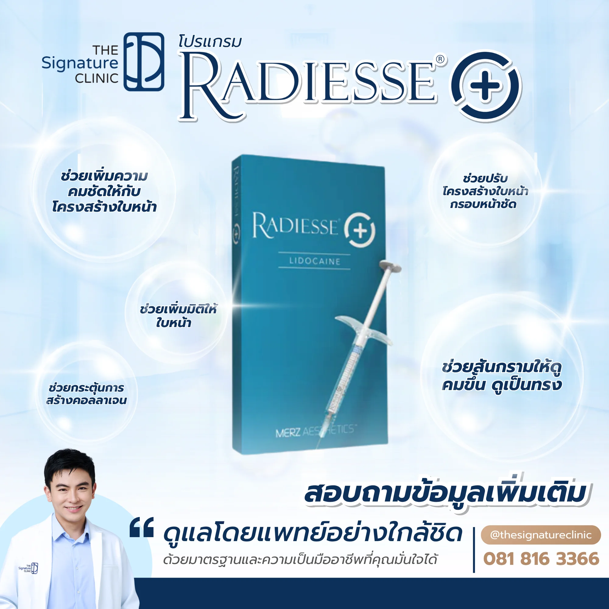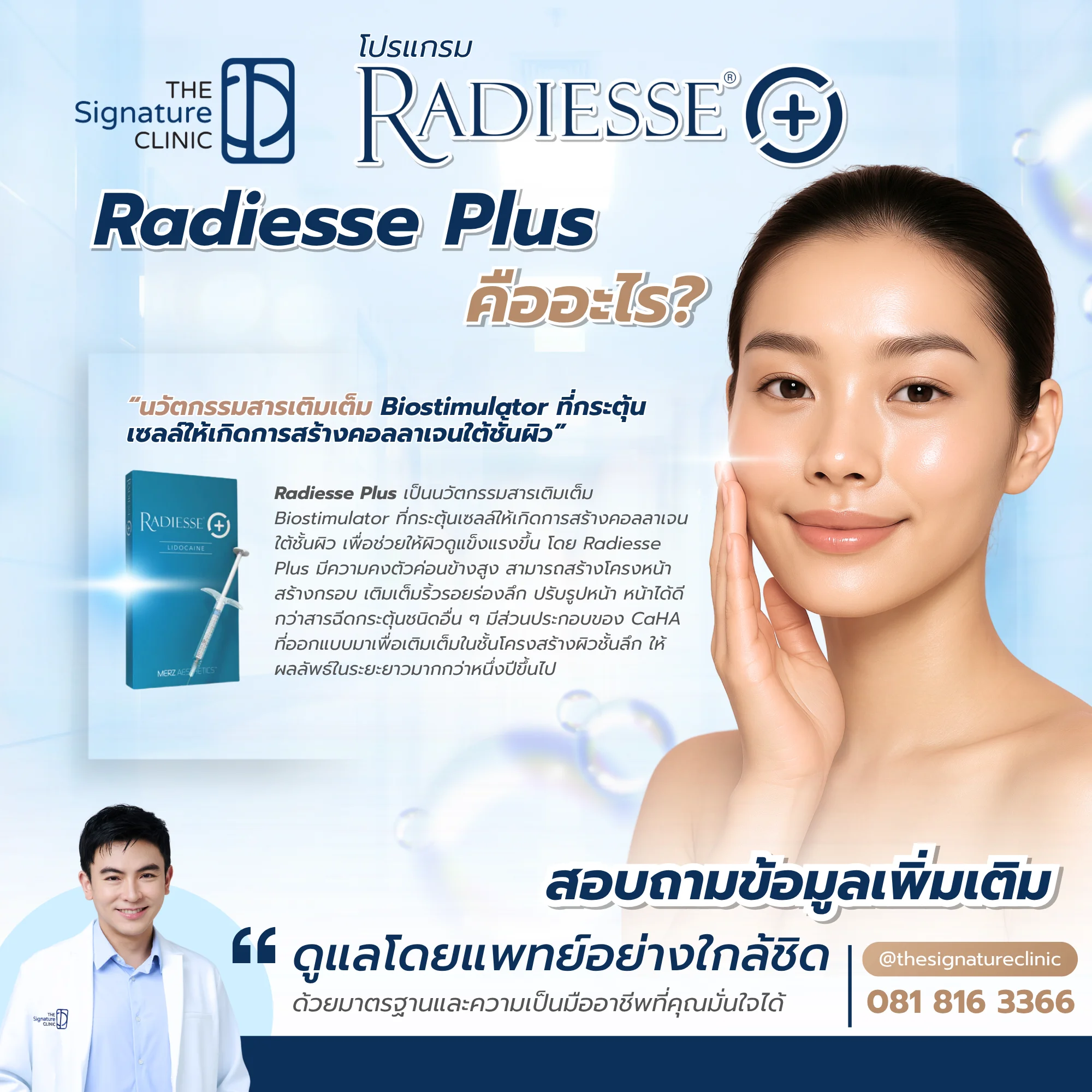 - หากต้องการรักษาด้วย Radiesse Plus ควรเลือกคลินิกที่ได้มาตรฐาน เช่น The Signature Clinic ซึ่งมีเทคนิคการฉีดที่แม่นยำ ลดความรู้สึกเจ็บ และใช้ผลิตภัณฑ์แท้ที่ได้รับการรับรอง