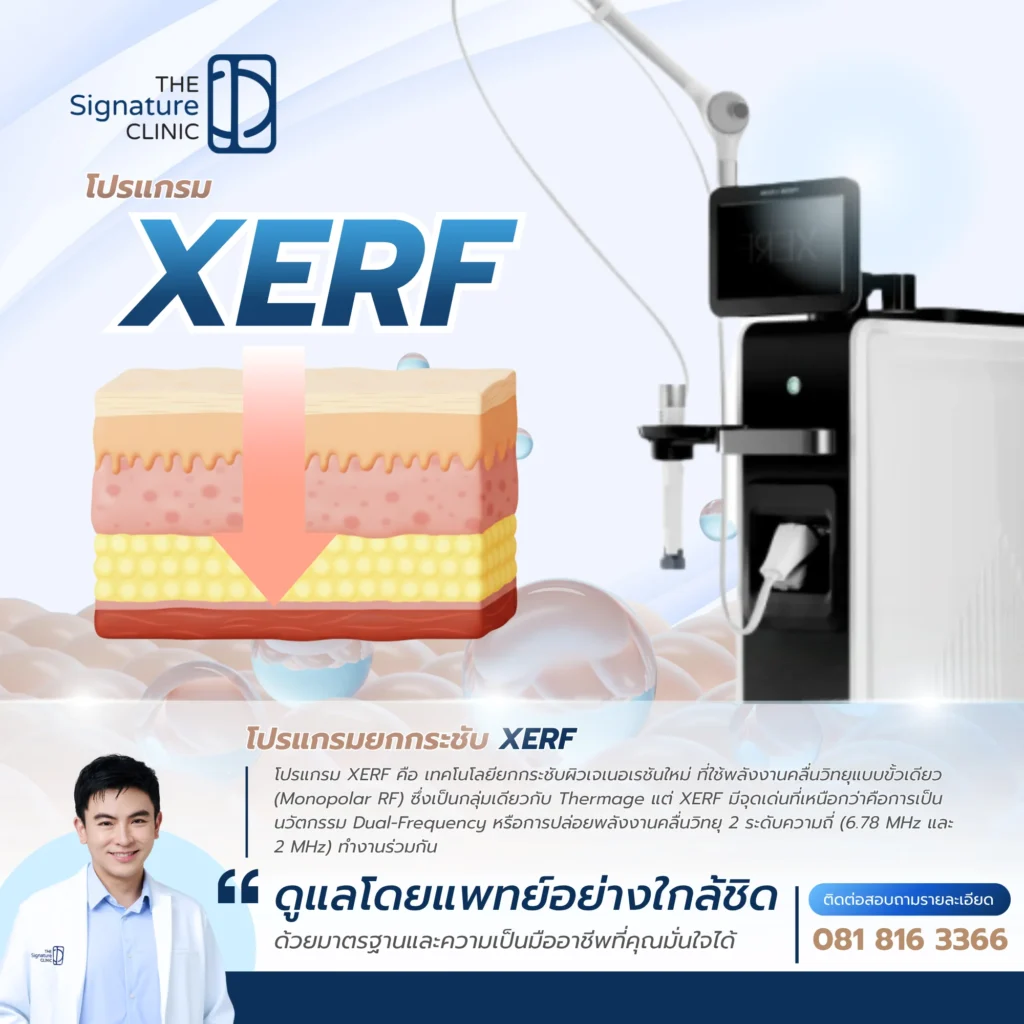 • โปรแกรม XERF คืออะไร: เป็นเทคโนโลยียกกระชับผิวด้วยคลื่นวิทยุ (Monopolar RF) รุ่นใหม่ ที่ใช้ 2 ความถี่ (Dual-Frequency) สลับกัน เพื่อส่งพลังงานความร้อนลงไปกระตุ้นคอลลาเจนในผิวหลายระดับความลึก ตั้งแต่ชั้นตื้นไปจนถึงชั้นไขมัน
