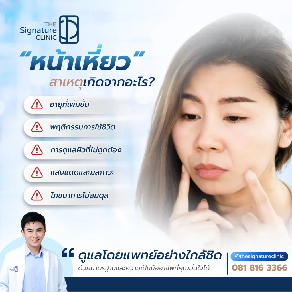 หน้าเหี่ยว เป็นปัญหาที่หลายคนต้องเผชิญเมื่ออายุเพิ่มขึ้น แต่กลับพบว่าในบางคน หน้ากลับเหี่ยวก่อนวัยอย่างเห็นได้ชัด จนดูแก่กว่าวัยจริง สาเหตุของภาวะนี้อาจไม่ใช่แค่อายุที่มากขึ้น แต่รวมถึงปัจจัยจากพฤติกรรมการใช้ชีวิตด้วยเช่นกัน บทความนี้จะพาคุณไปสำรวจว่าหน้าเหี่ยวเกิดจากอะไร มีความเกี่ยวข้องกับผิวแห้ง ริ้วรอย หรือพฤติกรรมในชีวิตประจำวันอย่างไร และสามารถป้องกันหรือรักษาได้ด้วยวิธีใดบ้าง ทั้งจากการดูแลตัวเองและการเข้ารับบริการที่ The Signature Clinic ที่ชำนาญด้านการดูแลผิวหน้าโดยเฉพาะ