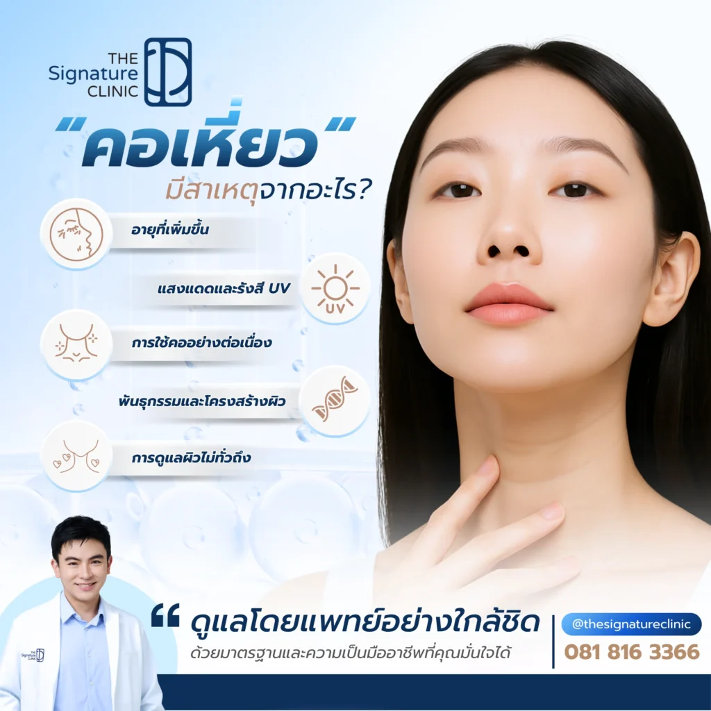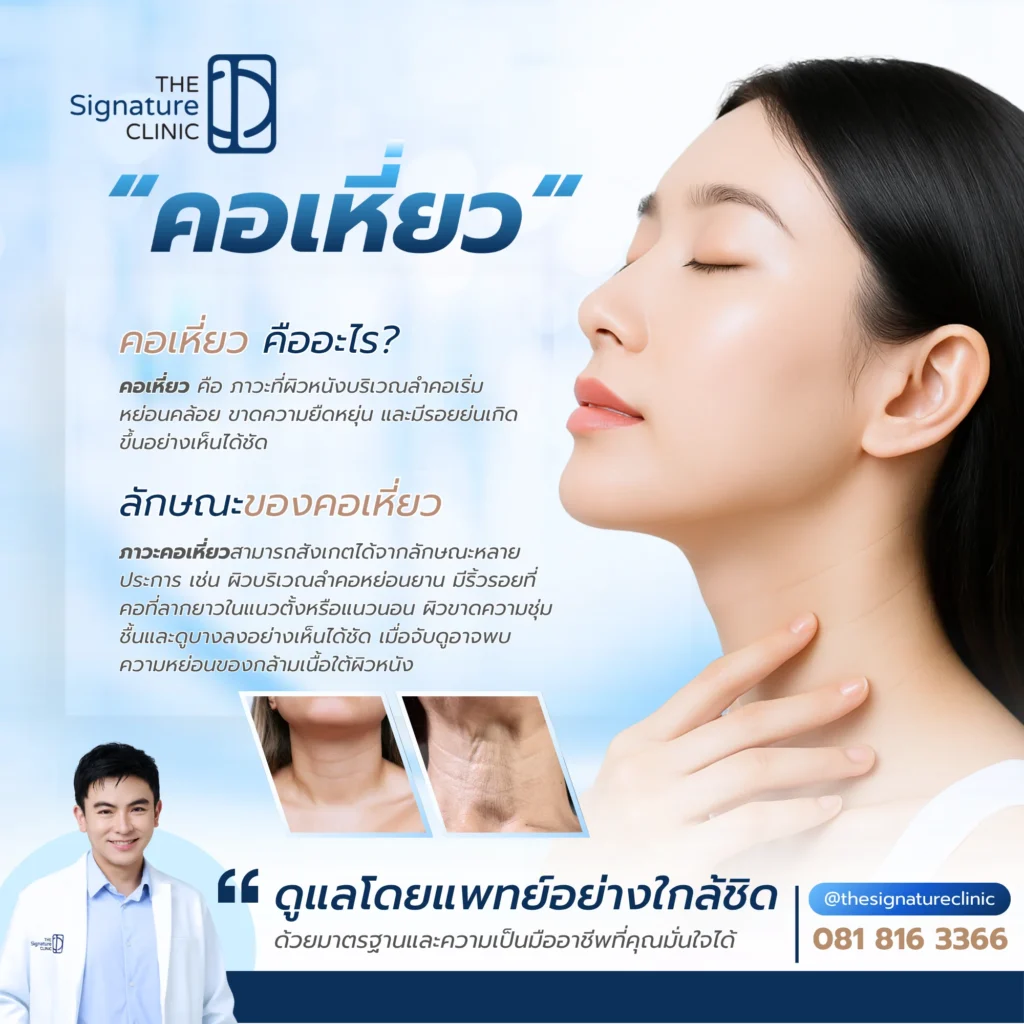 คอเหี่ยวเป็นหนึ่งในสัญญาณของวัยที่หลายคนมองข้าม ทั้งที่ลำคอถือเป็นบริเวณที่แสดงอายุได้ชัดเจนพอๆ กับใบหน้า ปัญหาผิวหย่อนคล้อย ริ้วรอยที่คอ หรือคอเป็นชั้นไม่เพียงส่งผลต่อความมั่นใจ แต่ยังเป็นข้อจำกัดในการแต่งตัวหรือการใช้ชีวิตประจำวัน The Signature Clinic เข้าใจถึงความสำคัญของการดูแลลำคอ จึงมุ่งพัฒนาแนวทางการรักษาเพื่อตอบโจทย์ผู้ที่เผชิญปัญหาคอเหี่ยวโดยเฉพาะ ทั้งวิธีธรรมชาติและการใช้เทคโนโลยีทางการแพทย์ที่ได้มาตรฐาน เพื่อผลลัพธ์ที่ปลอดภัยและตรงจุดที่สุด