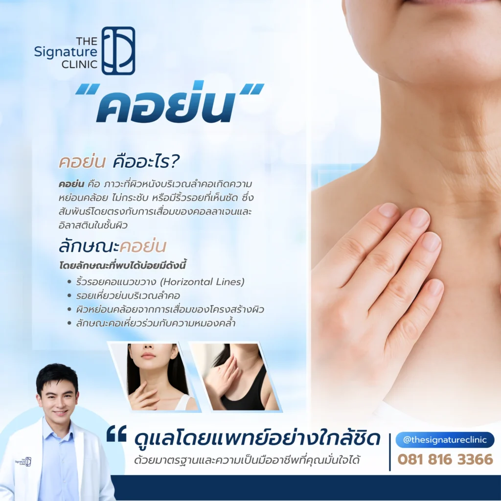 เคยสังเกตไหมว่าแม้ใบหน้ายังดูเต่งตึง แต่กลับมีริ้วรอยหรือความหย่อนคล้อยบริเวณลำคอ? ปัญหา “คอย่น” คือหนึ่งในสัญญาณของวัยที่หลายคนมองข้าม ทั้งที่ส่งผลต่อภาพลักษณ์โดยรวมอย่างชัดเจน บทความนี้จะพาคุณเข้าใจว่าคอย่นเกิดจากอะไร มีลักษณะอย่างไรในแต่ละช่วงอายุ และควรรับมืออย่างไรทั้งในเชิงป้องกันและการดูแล บริการของ The Signature Clinic พร้อมอธิบายแนวทางดูแลผิวคอที่ถูกต้อง ทั้งในรูปแบบการดูแลด้วยตนเอง และทางเลือกทางการแพทย์ที่ปลอดภัย เหมาะสมตามหลักวิชาการ