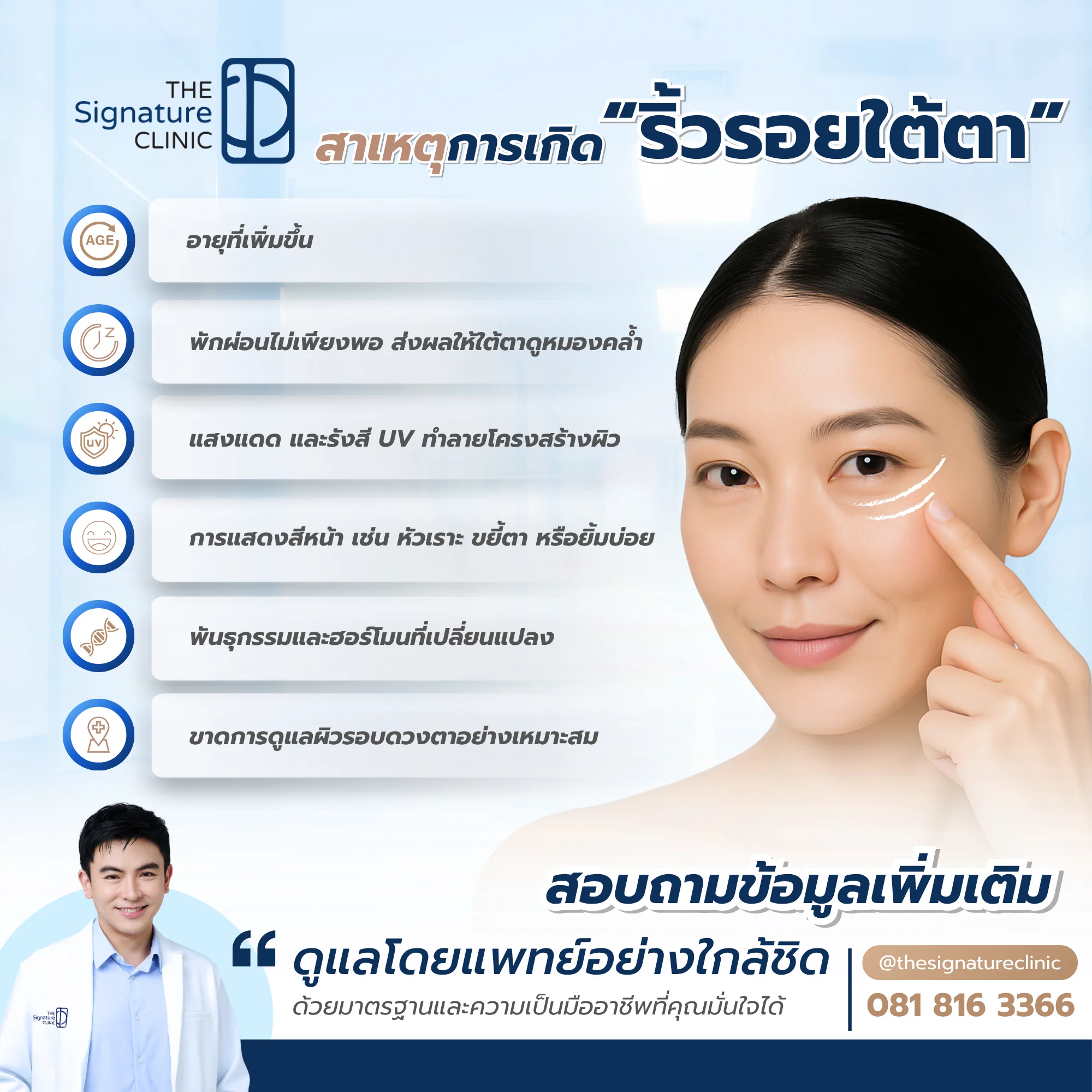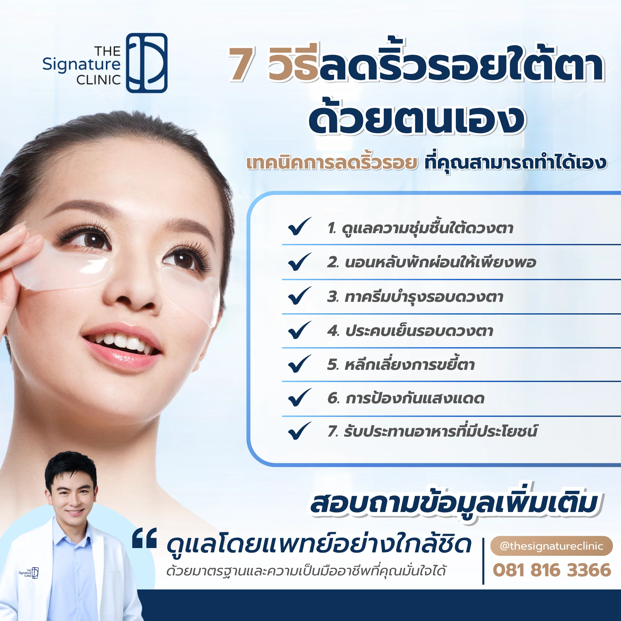 - The Signature Clinic ให้บริการรักษาริ้วรอยใต้ตาด้วยเทคนิคที่ปลอดภัย ไม่รุกล้ำ และใช้อุปกรณ์มาตรฐานระดับสากล พร้อมดูแลโดยแพทย์ผู้ชำนาญเฉพาะด้าน