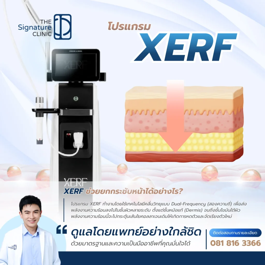 ที่ The Signature Clinic เรายึดมั่นในการมอบผลลัพธ์ที่เป็นธรรมชาติและเหมาะสมกับแต่ละบุคคล เราเลือกใช้โปรแกรม XERF เป็นหนึ่งในนวัตกรรมหลักในการ “ยกกระชับหน้า” และปรับคุณภาพผิว เพราะเราเชื่อมั่นในเทคโนโลยีที่ผ่านการรับรองและให้ผลลัพธ์ที่ดี ภายใต้การดูแลโดยทีมแพทย์ผู้มีความชำนาญการ ที่พร้อมประเมินและออกแบบการรักษาเฉพาะบุคคล (Personalized Plan) เพื่อให้คุณได้รับประสบการณ์การดูแลที่ดีที่สุดในสภาพแวดล้อมที่สะอาดและเป็นมืออาชีพ