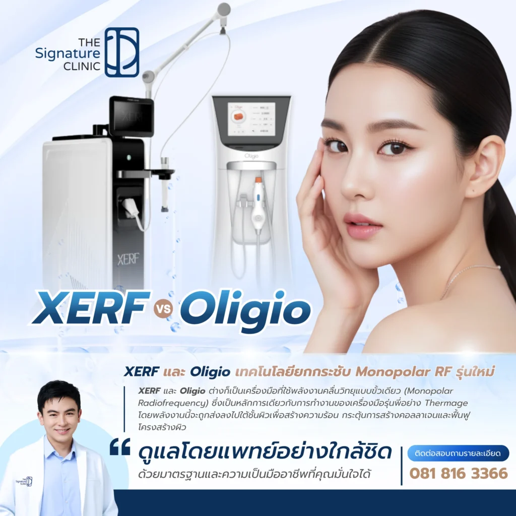 ในวงการนวัตกรรมยกกระชับผิวที่กำลังมาแรง หนึ่งในคำถามที่หลายคนสงสัยคือ XERF กับ Oligio ต่างกันยังไง? ทั้งสองชื่อนี้เป็นเทคโนโลยียอดนิยมในกลุ่ม Monopolar RF ที่ช่วยยกกระชับหน้าโดยไม่ต้องผ่าตัด แต่ด้วยคุณสมบัติที่แตกต่างกัน การเลือกให้เหมาะกับปัญหาผิวจึงเป็นสิ่งสำคัญ บทความนี้จะมาเปรียบเทียบ XERF vs Oligio แบบชัดเจน ทั้งเรื่องหลักการทำงาน ผลลัพธ์ที่ได้ ความรู้สึกขณะทำ ไปจนถึงคำถามสำคัญว่า Oligio ดีไหม XERF ราคาเท่าไหร่ หรือ Oligio เจ็บไหม เพื่อให้คุณมีข้อมูลครบถ้วนก่อนตัดสินใจเลือกโปรแกรมยกกระชับหน้าที่เหมาะกับคุณ