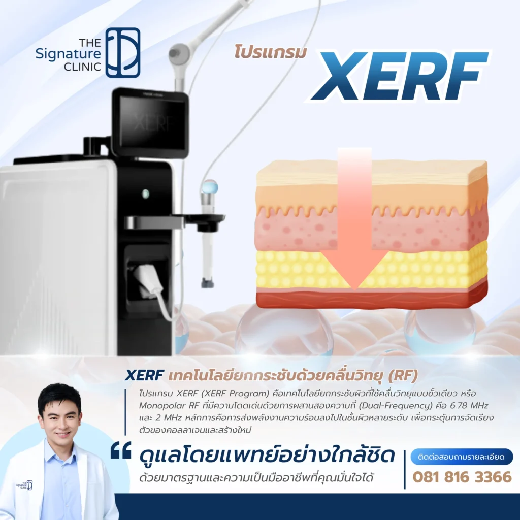 โปรแกรม XERF (XERF Program) คือเทคโนโลยียกกระชับผิวที่ใช้คลื่นวิทยุแบบขั้วเดียว หรือ Monopolar RF ที่มีความโดดเด่นด้วยการผสานสองความถี่ (Dual-Frequency) คือ 6.78 MHz และ 2 MHz หลักการคือการส่งพลังงานความร้อนลงไปในชั้นผิวหลายระดับ เพื่อกระตุ้นการจัดเรียงตัวของคอลลาเจนและสร้างใหม่ โปรแกรม XERF จึงช่วยในเรื่องการยกกระชับผิว (Lifting) และปรับปรุงคุณภาพผิว (Skin Quality) ให้แน่นขึ้น ลดความหย่อนคล้อย และช่วยให้กรอบหน้าชัดเจนขึ้น ซึ่งที่ The Signature Clinic มีโปรแกรมที่ผสานเทคโนโลยีนี้เข้ากับการรักษาอื่น ๆ เพื่อผลลัพธ์ที่ดียิ่งขึ้น (Potenza Duo RF)
