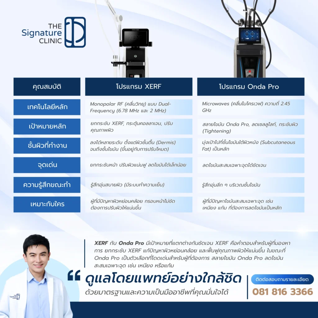 | เป้าหมายหลัก | ยกกระชับ XERF, กระตุ้นคอลลาเจน, ปรับคุณภาพผิว | สลายไขมัน Onda Pro, ลดเซลลูไลท์, กระชับผิว (Tightening) |