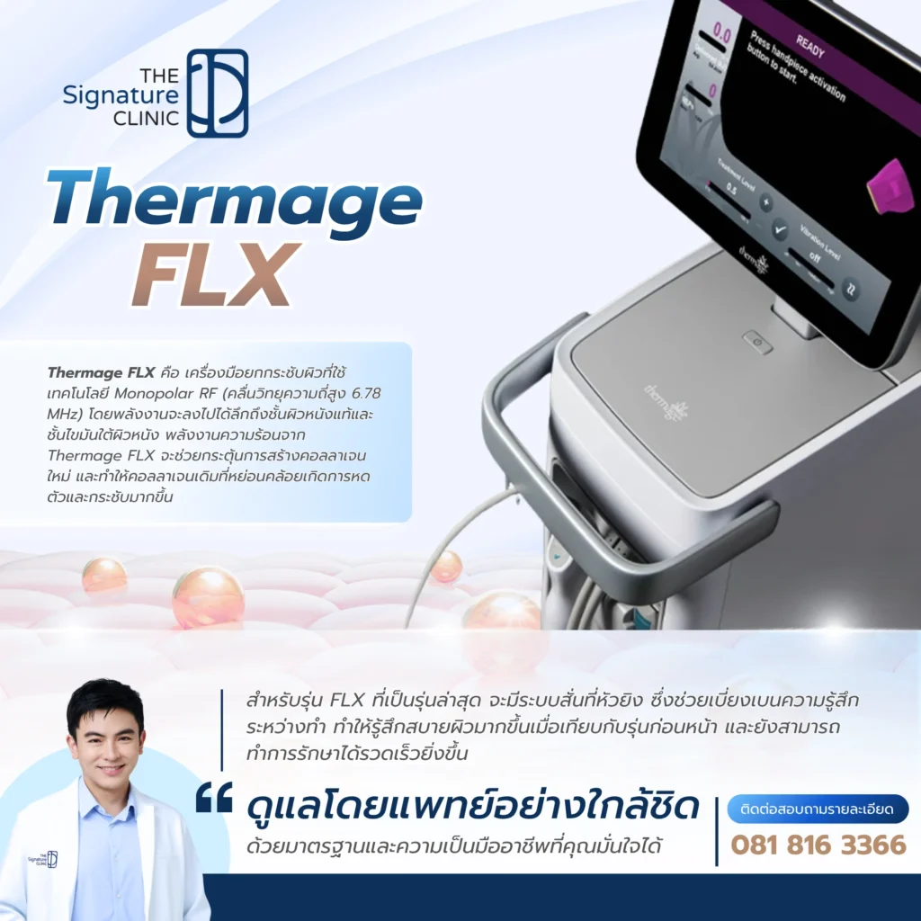 Thermage FLX คือเครื่องมือยกกระชับผิวที่ใช้เทคโนโลยี Monopolar RF (คลื่นวิทยุความถี่สูง 6.78 MHz) ซึ่งเป็นที่รู้จักและมีการใช้งานมาอย่างยาวนานในวงการแพทย์ความงาม โดยพลังงานจะลงไปได้ลึกถึงชั้นผิวหนังแท้และชั้นไขมันใต้ผิวหนัง พลังงานความร้อนจาก Thermage FLX จะช่วยกระตุ้นการสร้างคอลลาเจนใหม่ และทำให้คอลลาเจนเดิมที่หย่อนคล้อยเกิดการหดตัวและกระชับมากขึ้น สำหรับรุ่น FLX ที่เป็นรุ่นล่าสุด จะมีระบบสั่นที่หัวยิง ซึ่งช่วยเบี่ยงเบนความรู้สึกระหว่างทำ ทำให้รู้สึกสบายผิวมากขึ้นเมื่อเทียบกับรุ่นก่อนหน้า และยังสามารถทำการรักษาได้รวดเร็วยิ่งขึ้น
