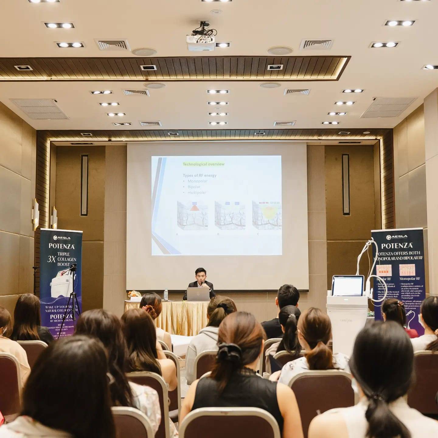 นายแพทย์ภูริวัจน์ อริยกุศลสุทธิ ได้มาถ่ายทอดความรู้และประสบการณ์ตรงให้กับเหล่าแพทย์ปริญญาโท เกี่ยวกับเทคโนโลยีของเครื่อง POTENZA ทั้งในแง่ของประสิทธิภาพและความหลากหลายในการใช้งาน รวมถึงความแตกต่างเมื่อเปรียบเทียบกับกลุ่มเทคโนโลยี Microneedling ด้วยกัน ซึ่งล้วนเป็นข้อมูลเชิงลึกที่ได้รับความสนใจจากผู้เข้าร่วมฟังบรรยายในครั้งนี้เป็นอย่างมาก โดยในช่วงของการ Demonstration ผู้ร่วมงานก็ได้เข้าถึงประสิทธิภาพและความหลากหลายในการใช้งาน ซึ่งมีเคสตัวอย่างเป็นกรณีศึกษาทั้งในด้านการยกกระชับและปรับ Texture ให้กับผิว ถือเป็นช่วงที่สร้างความตื่นตาตื่นใจให้กับบรรดาผู้เข้าร่วมงานมากเป็นพิเศษ เพราะได้รับการถ่ายทอดประสบการณ์จาก KOL อย่างหมอบอลโดยตรงอย่างใกล้ชิด